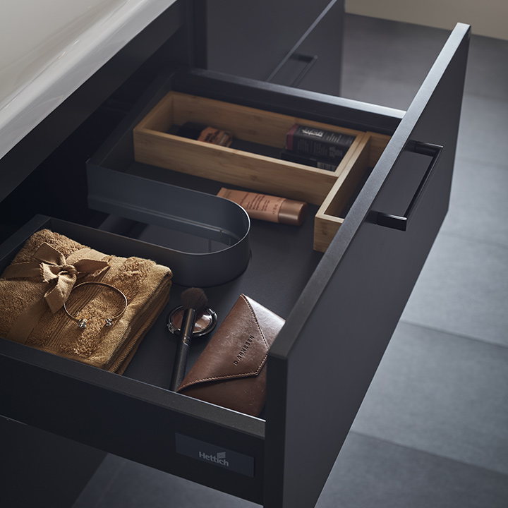 Skuffer med Softclose og fuldt udtræk giver et godt overblik over indholdet. Skuffemåtter og skuffeindretning i bambus hjælper med at holde orden. Underskabet er færdigmonteret og nemt at montere med justerbare ophængsbeslag og klargjort til både væg- og gulvafløb. Vælg et håndtag eller knop, der passer til din stil. Køb til vandhane, bundventil, vandlås, skuffebelysning og stikkontakt.