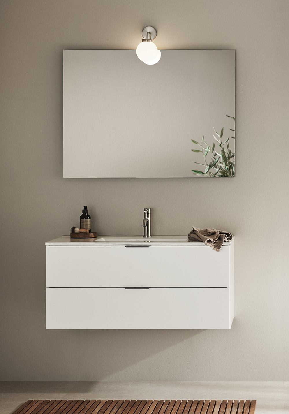 Underskabet er færdigmonteret og er nemt at installere med vægskinne og justerbare ophængsbeslag, skabet er forberedt for gulv- eller vægafløb. Vasken har overløbshul og store overflader. Hafa Go badeværelsesskab får i flere forskellige bredder og farver. Håndtag, vandhane, bundventil, vandlås og stikkontakt sælges separat.