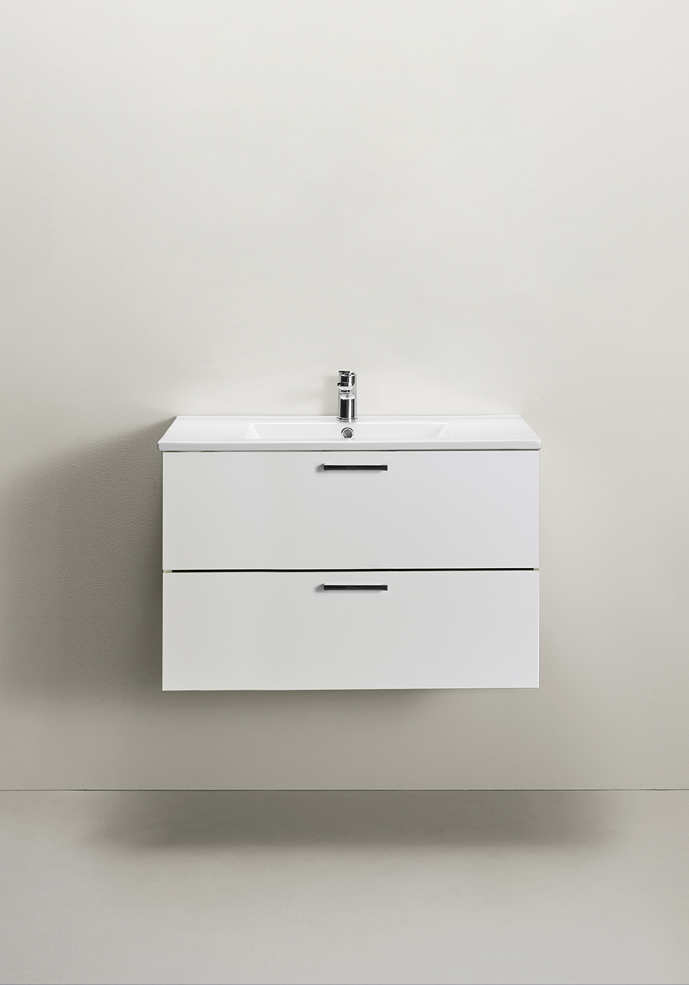 Hafa Go underskab med porcelænsvask er praktiske og stilrene badeværelsesmøbler med glatte fronter og med mulighed for at sætte din egen stil og præg gennem at vælge vores håndtag. To skuffer med SoftClose og fuldt udtræk giver et godt overblik over indeholdet.