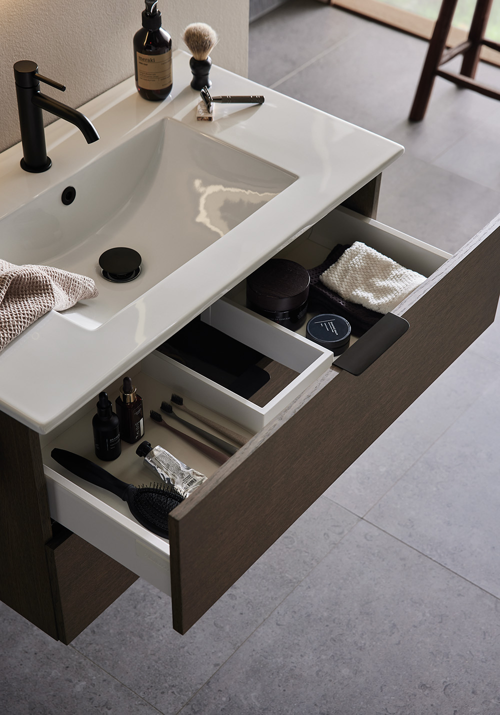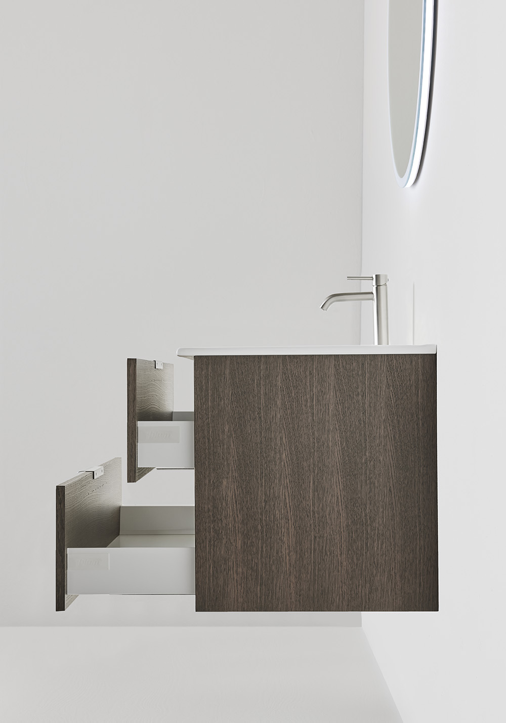 Hafa Go underskab er praktiske og stilrene badeværelsesmøbler med glatte fronter. Komplettér med vask og skab din personlige stil med hjælp af vores håndtag. To skuffer med SoftClose og fuldt udtræk giver et godt overblik over indeholdet i skuffen.
