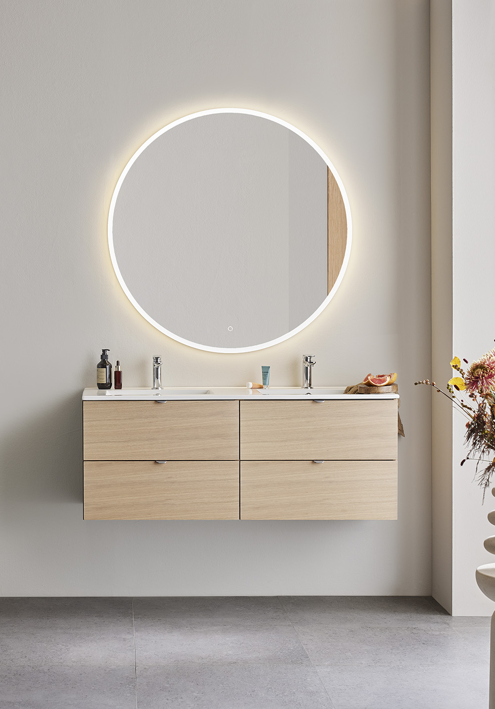 Hafa Go underskab er praktiske og stilrene badeværelsesmøbler med glatte fronter. Komplettér med vask og skab din personlige stil med hjælp af vores håndtag. To skuffer med SoftClose og fuldt udtræk giver et godt overblik over indeholdet i skuffen.
