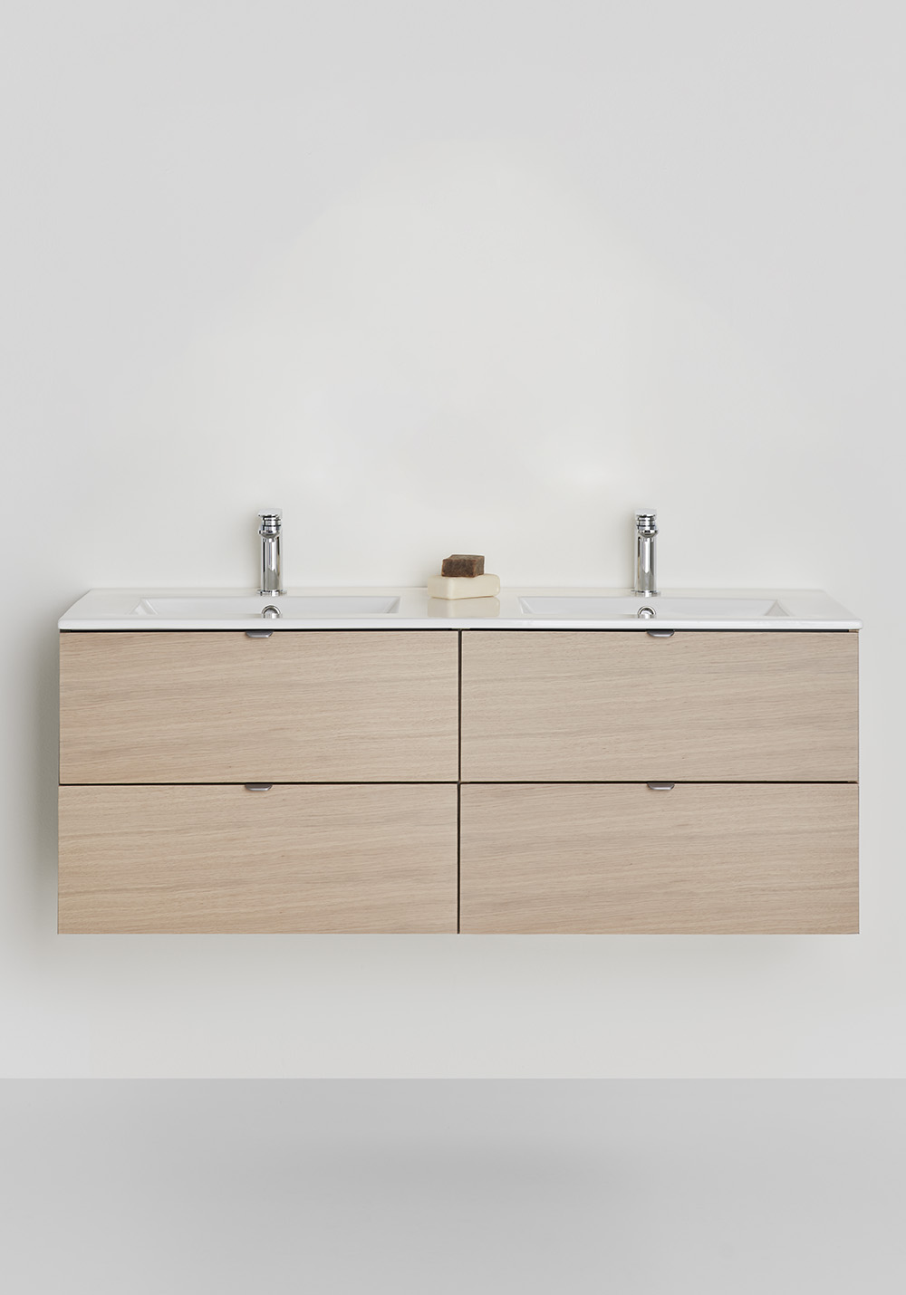 Hafa Go underskab med porcelænsvask er praktiske og stilrene badeværelsesmøbler med glatte fronter og med mulighed for at sætte din egen stil og præg gennem at vælge vores håndtag. To skuffer med SoftClose og fuldt udtræk giver et godt overblik over indeholdet.
