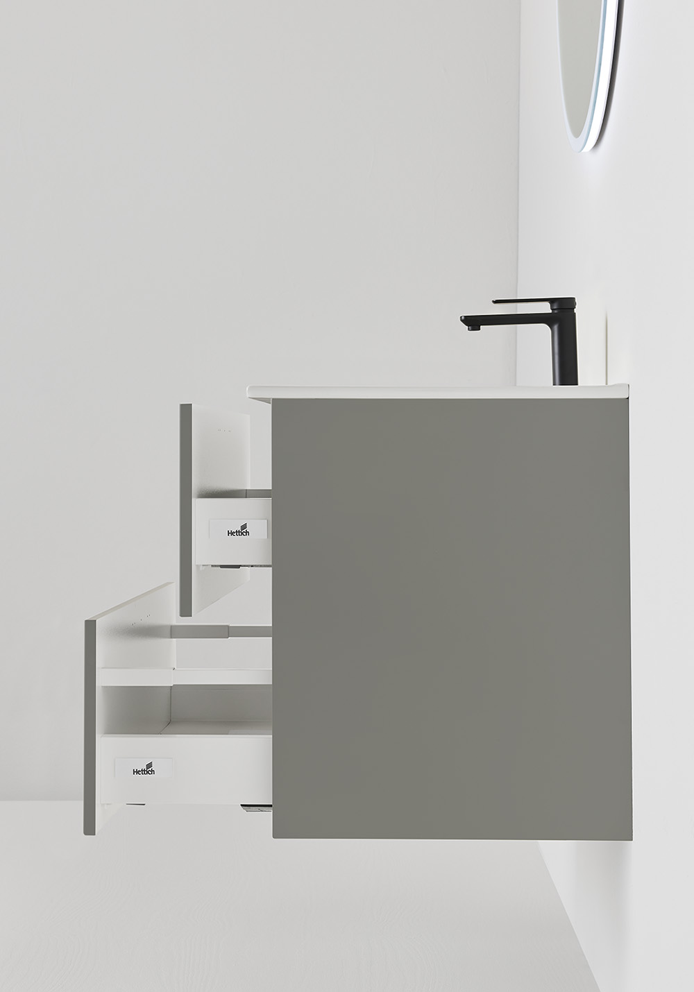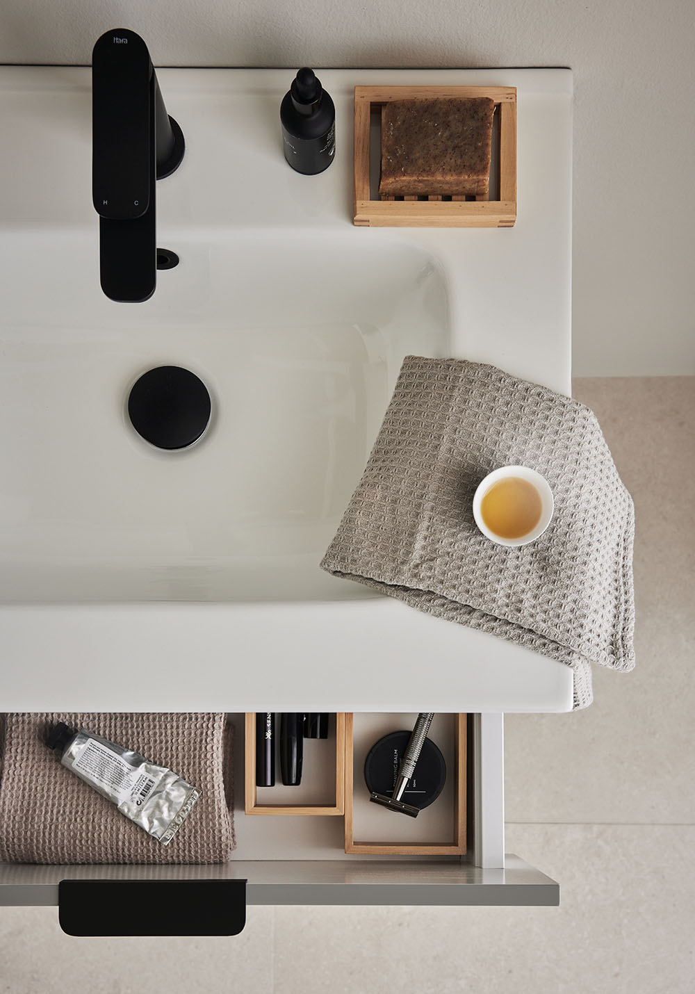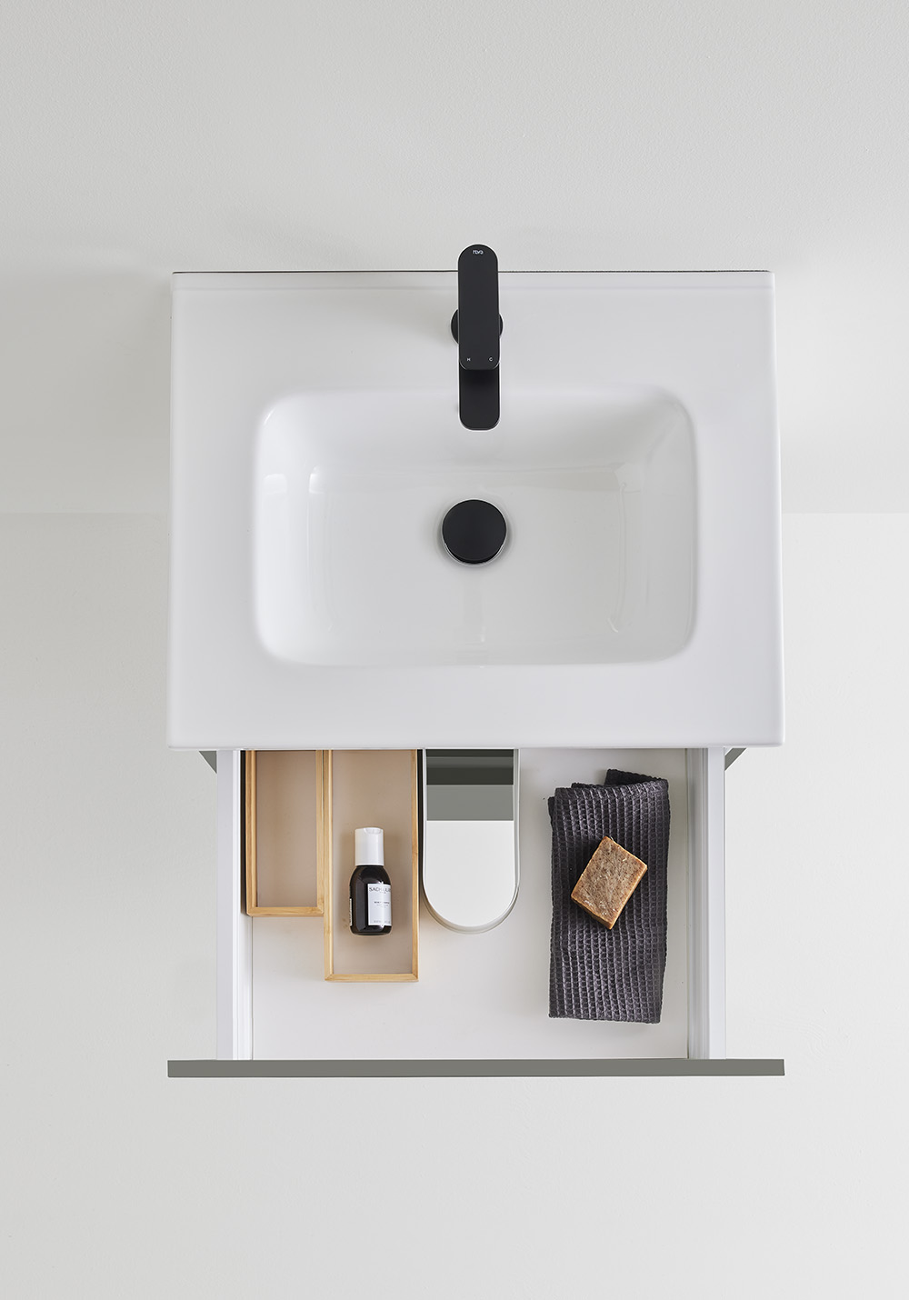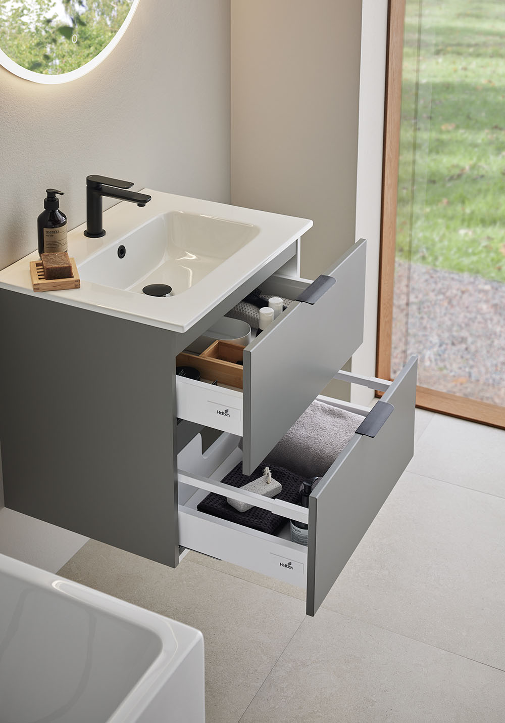 Vasken i porcelæn har en blødt formet kumme og store opbevaringsområder samt overløb. Blødlukkende skuffer med fuldt udtræk giver et godt overblik over indholdet. Skuffeunderlag og to bambusrammer hjælper med at holde orden i skufferne. Badeværelsesskabet er let at montere med en vægskinne og justerbare ophængningsbeslag. Det er også forberedt til både væg- og gulvafløb.