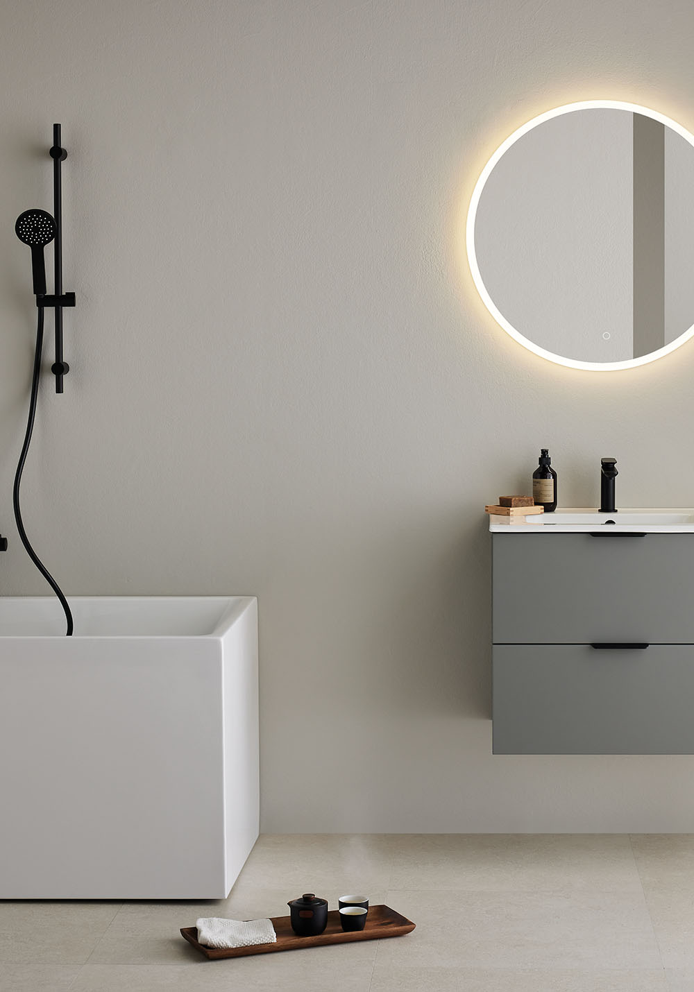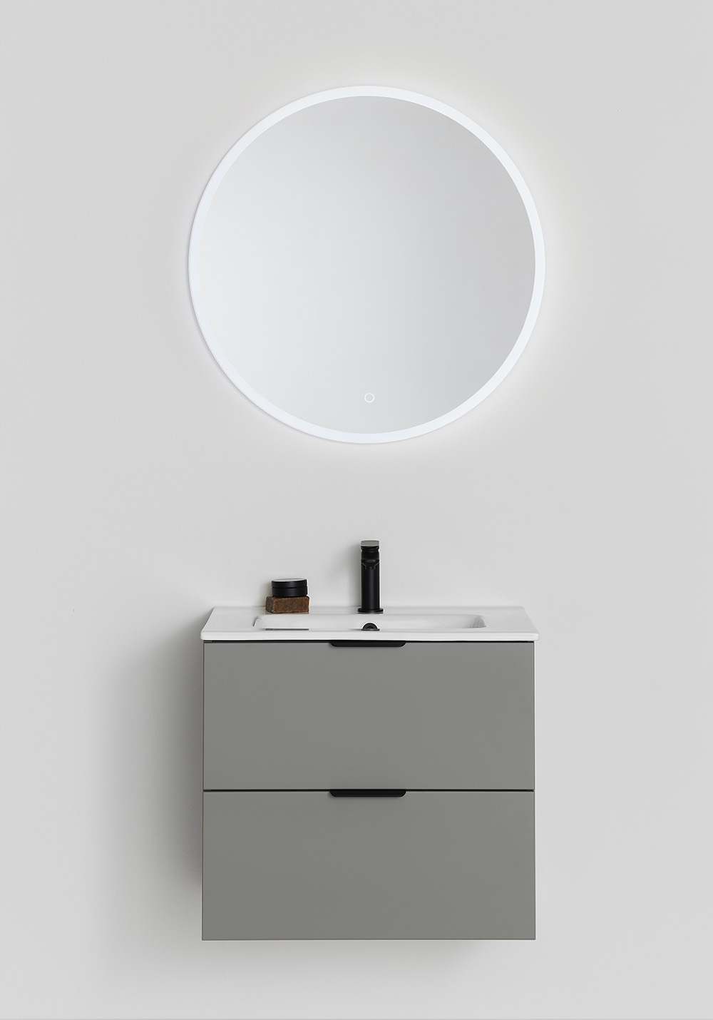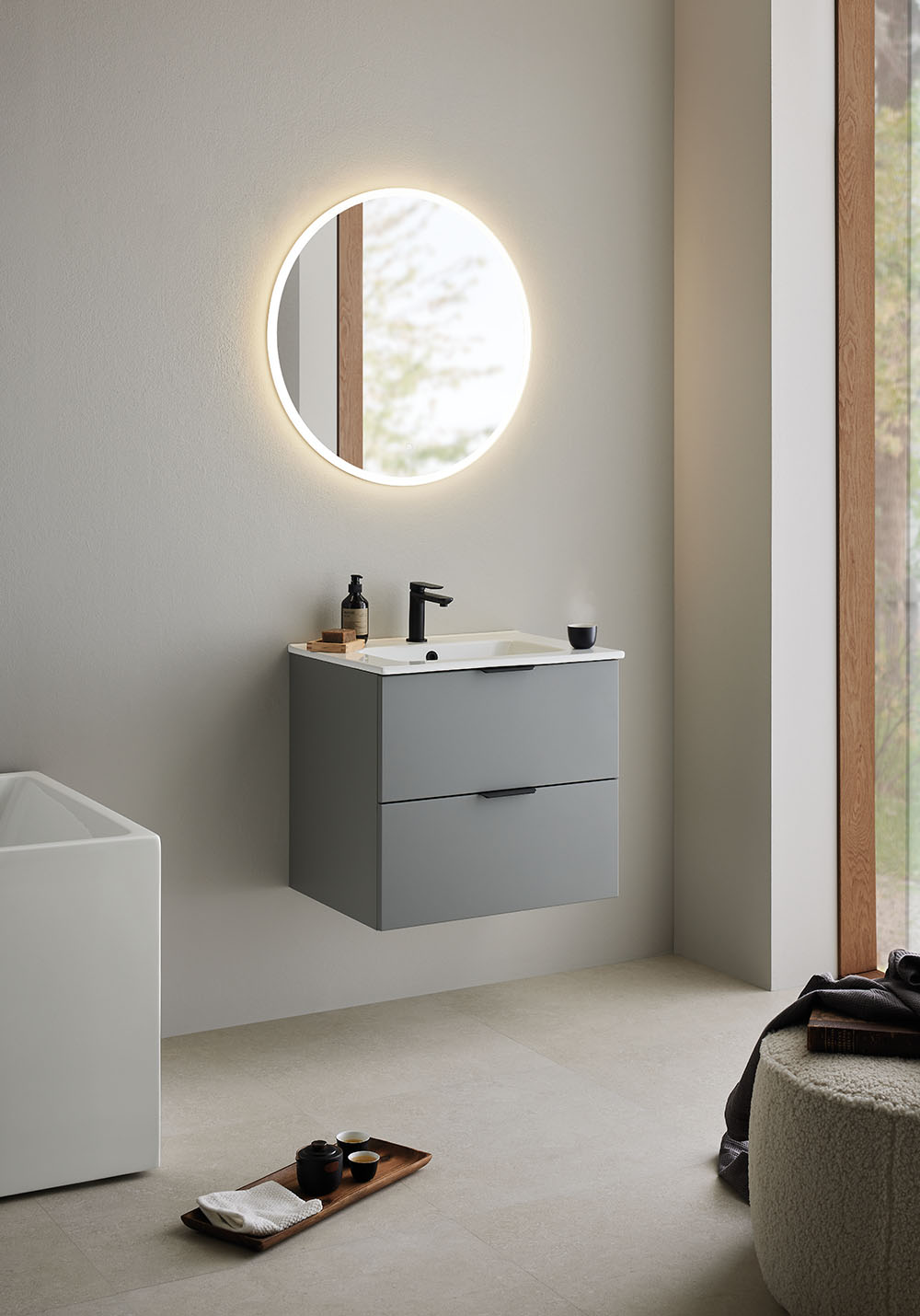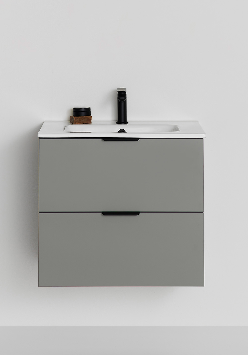 Underskab Hafa Storm med håndvask i porcelæn har en smuk mat, varm grå farve, som sammen med det stramme og enkle design giver dig et møbel du vil have glæde af i mange år. Tilføj greb der passer til din stil og komplettér med blandingsbatteri, bundventil og vandlås.