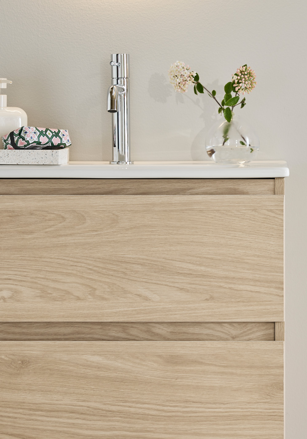 Hafa Style håndvaskskab fås i bredderne 600, 800, 1000 og 1200 og i farverne mat hvid, smukt mønstret overflade af eg eller brun eg. Badeværelsesskabet er nemt at installere med en komplet vægskinne og justerbare ophængningsbeslag. Det er også forberedt for både væg- og gulvafløb.