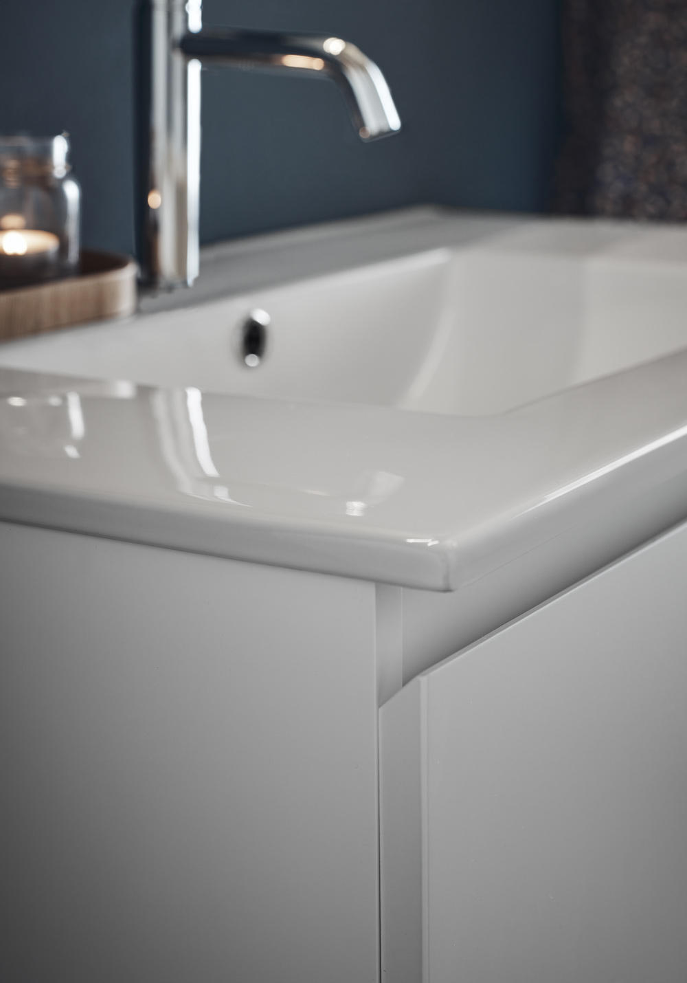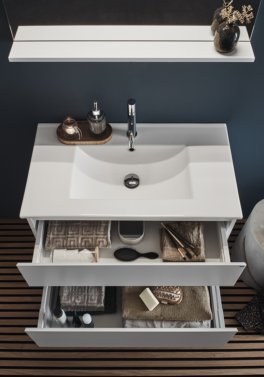 Vaskeskabet Hafa Style i mat hvid har integreret greb, hvilket giver møblet et stilrent udtryk. De to softclose-skuffer har skuffemåtter og fuldt udtræk, så du nemt får adgang til alt indhold. Tilkøb håndvask, armatur, bundventil, vandlås og strømudtag.
