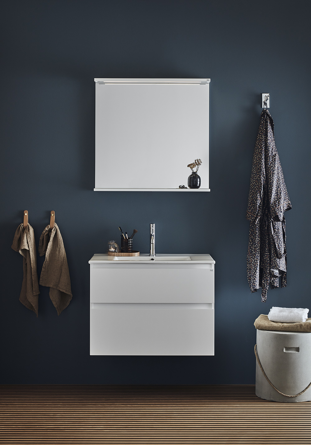 Hafa Style vaskeskab fås i bredderne 600, 800, 1000 og 1200 mm, og i farverne lakeret mat hvid, samt smuk mønstret eg eller brun eg. Badeværelsesmøblet er nemt at montere med vægskinne og justerbare ophængsbeslag. Det er desuden forberedt for både gulv- og vægafløb.