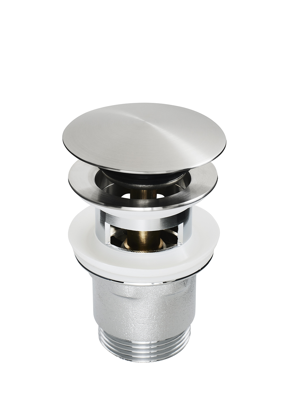 Pop up bundventil i rustfrit stål med stort fjedret låg og børstet overflade. Til håndvaske med overløb.
