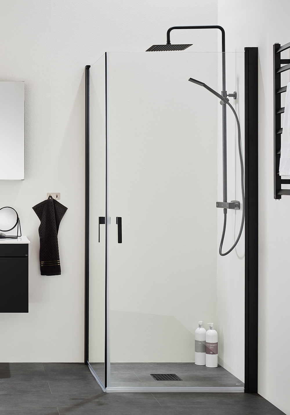 Rummeligt brusehjørne med lige dører i klart glas, profiler og greb i aluminium eller sort mat. Når bruseren ikke er i brug, kan brusedørene vinkles mod væggen, hvilket frigør plads på badeværelset. Brusehjørnet er stabilt med vægprofiler, der kan monteres med skruer eller limbrikker. Bruserhjørnet har en patenteret løsning til nem installation og justering, Hafas InstaQuick ™. Dørene har løftehængsler så de ikke rører gulvet ved åbning og er vendbare så du kan vælge hvordan de skal monteres. 6 mm hærdet sikkerhedsglas. Højde 2000 mm. Kan monteres med påbygningrør, 35 mm. 22 mm gulvliste, magnetliste og håndtag medfølger.
