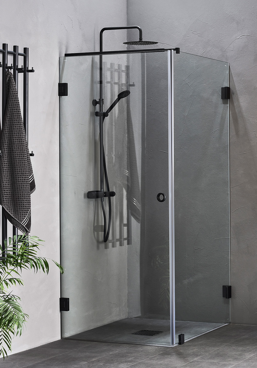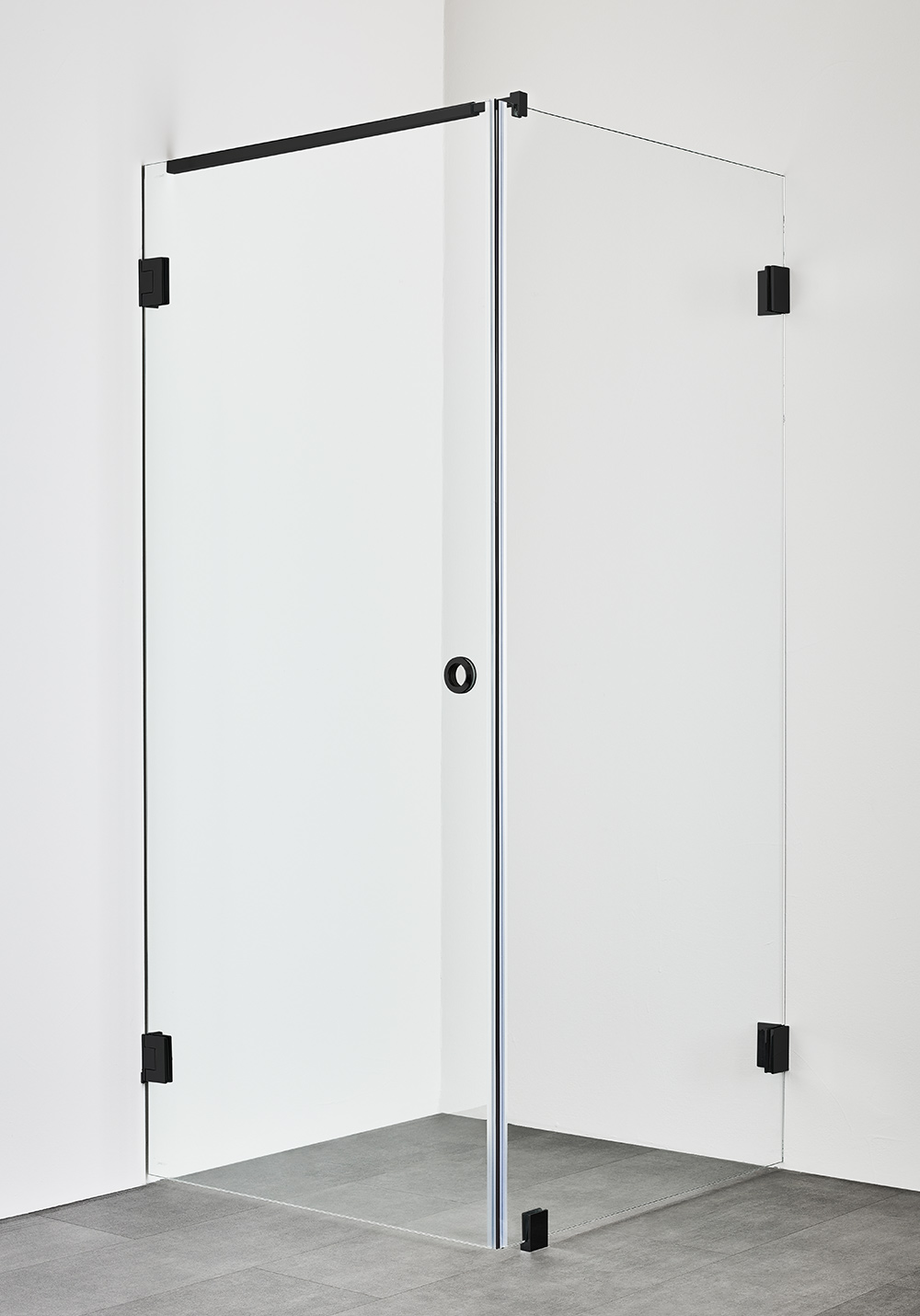 Eksklusivt brusehjørne med slanke beslag og en elegant håndtagsløsning. Vælg mellem tre farver, krom, mat sort eller børstet messingsfarve. De store glasoverflader giver et luftigt indtryk og skaber et dejligt rum i badeværelset. Brusehjørnet består af en fast væg og en dør, der kan åbnes. Døren og væggen er vendbare, så du kan vælge, om døren skal placeres til højre eller venstre. Husk, at Infinity ikke har tætningslister som standard, så et korrekt gulvfald bliver ekstra vigtigt. Magnetliste inkluderet. Fuld højde 2000 mm og med 8 mm hærdet klart sikkerhedsglas.