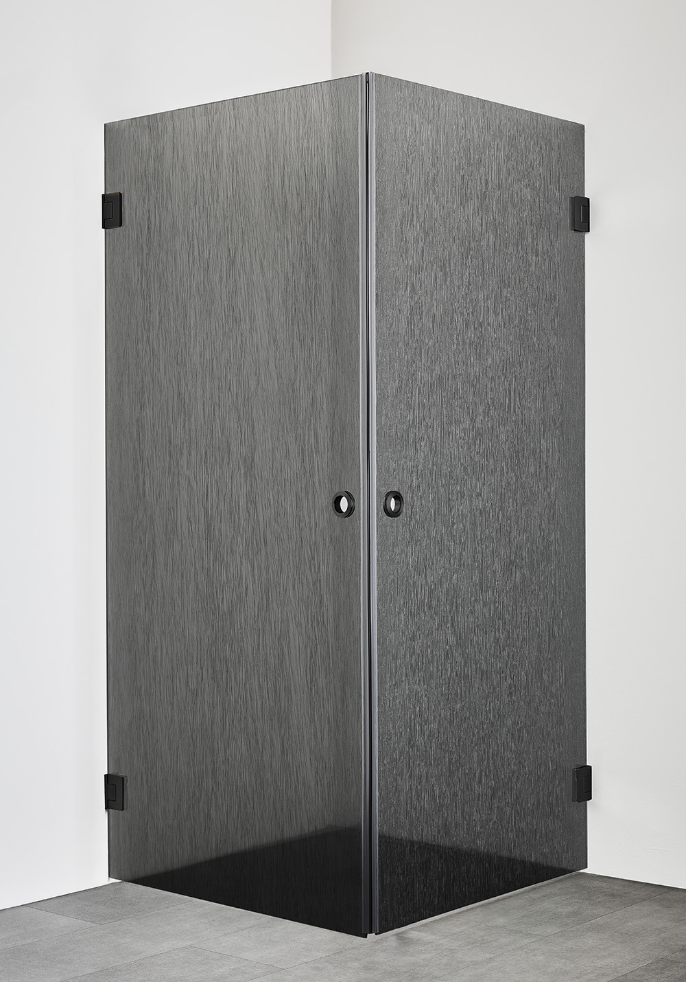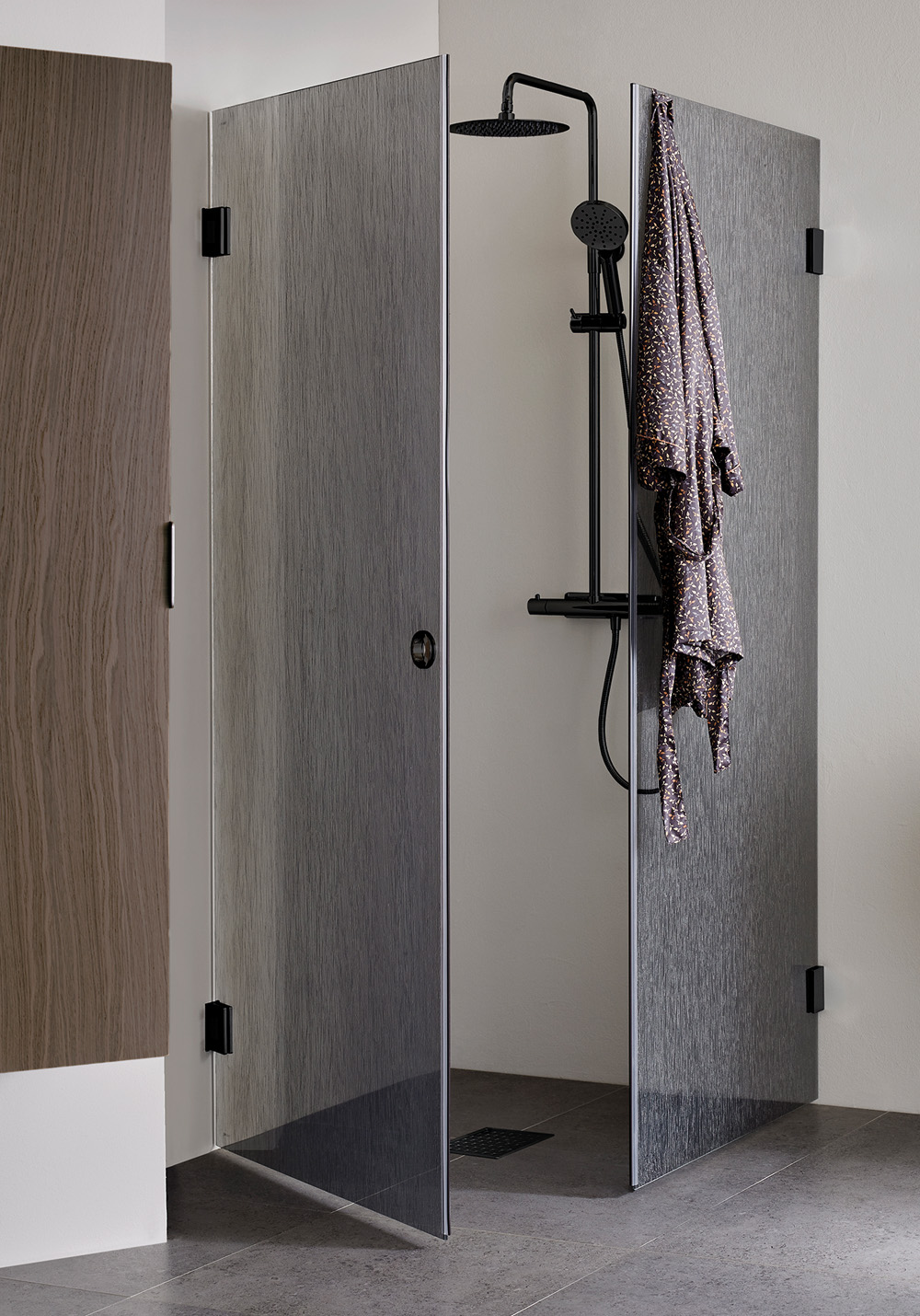 Eksklusivt brusehjørne med slankt beslag og en elegant håndtagsløsning. Vælg mellem tre farver – krom, matsort eller børstet messing – og mellem klart glas eller Lace-glas med metallisk tekstileffekt. De store glasoverflader giver et luftigt indtryk og skaber et dejligt rum i badeværelset. Dørene er vendbare og kan foldes ind i væggen, når de ikke er i brug, hvilket giver mulighed for at skabe et luksuriøst brusebad selv i et mindre badeværelse. Husk, at Infinity ikke har tætningslister som standard, så et korrekt gulvfald bliver ekstra vigtigt. Magnetliste inkluderet. Fuld højde 2000 mm og med 8 mm hærdet sikkerhedsglas.