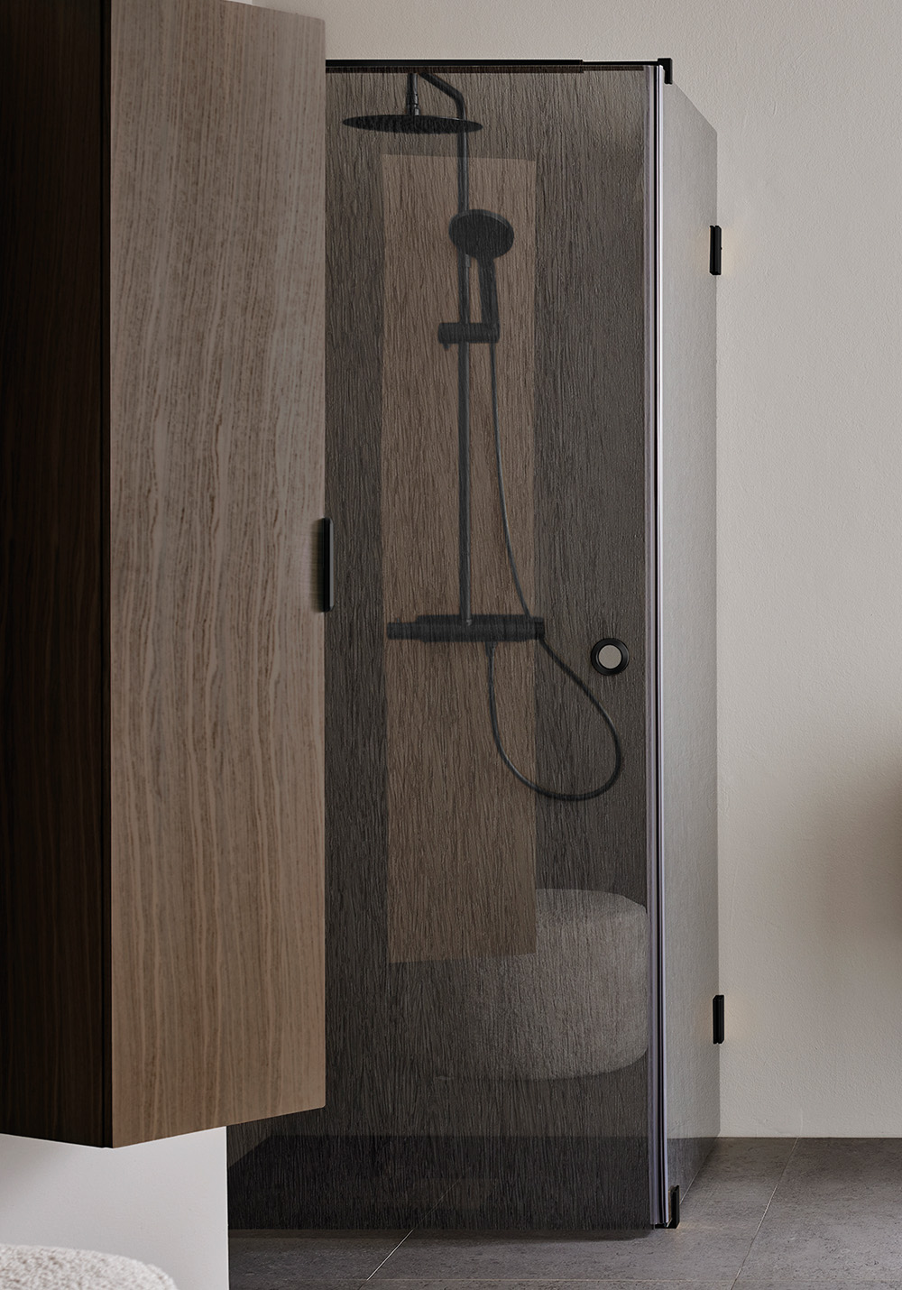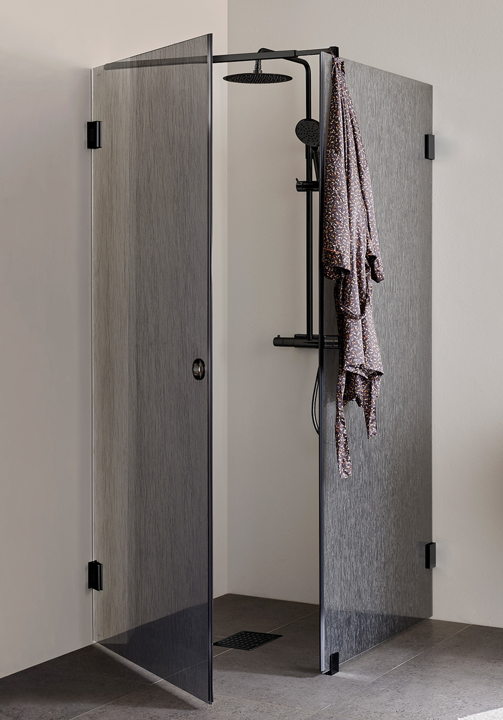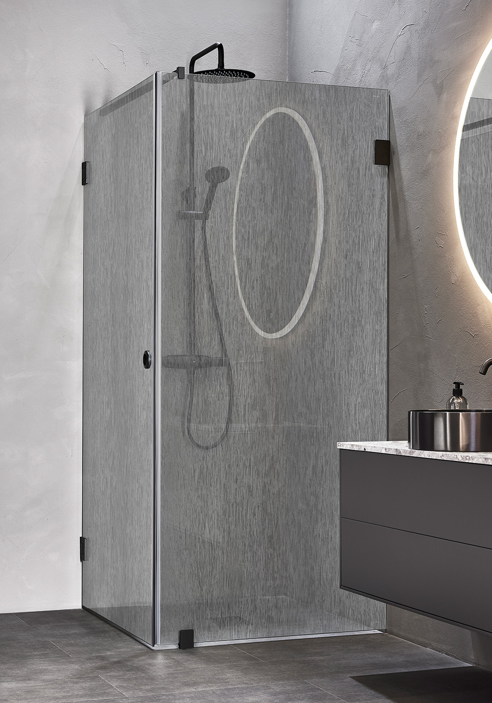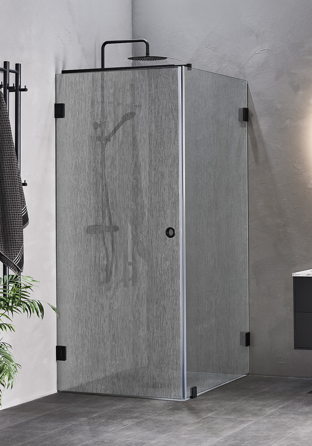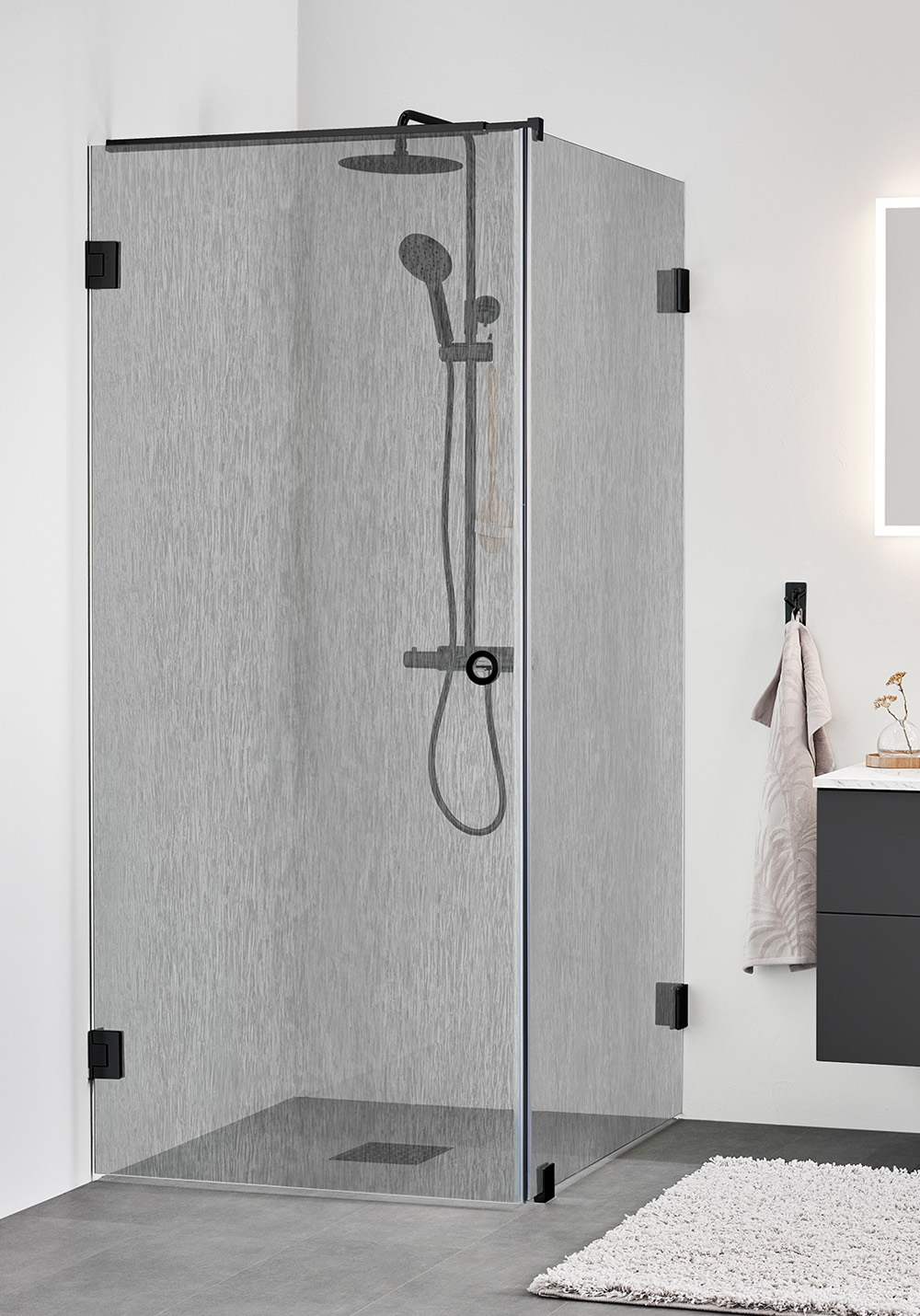 Eksklusivt brusehjørne med slanke beslag og en elegant håndtagsløsning.Vælg mellem tre farver – krom, matsort eller børstet messing – og mellem klart glas eller Lace-glas med metallisk tekstileffekt. De store glasoverflader giver et luftigt indtryk og skaber et dejligt rum i badeværelset. Brusehjørnet består af en fast væg og en dør, der kan åbnes. Døren og væggen er vendbare, så du kan vælge, om døren skal placeres til højre eller venstre. Husk, at Infinity ikke har tætningslister som standard, så et korrekt gulvfald bliver ekstra vigtigt. Magnetliste inkluderet. Fuld højde 2000 mm og med 8 mm hærdet sikkerhedsglas.