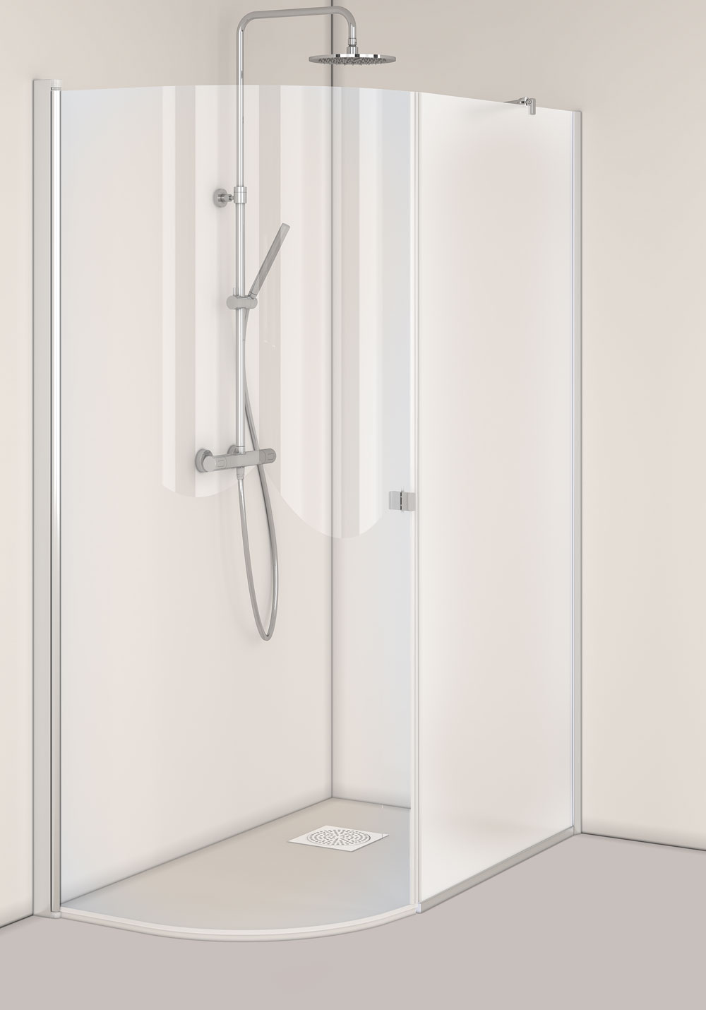 Brusehjørne med en svingbar J-dør og en fast brusevæg. Dørene er vendbare og kan derfor højreeller venstremonteres. Brusestangen kan monteres på tre måder: på væggen, i loftet eller vinkelret på samme væg, hvor bruseren monteres. Det er monteringsvenligt og har limbare profiler i aluminium. Nemt at installere og justere for én person, InstaQuick™. Henholdsvis 6 mm (A) og 8 mm (B) hærdet sikkerhedsglas. 8 mm frihøjde fra gulvet. Højde 2000 mm. (A) Kan monteres med udvendige 12-mm-rør, cc 35 mm. (B) Der fås en forlængelsesprofil til udvendige rør. 22 mm glideskinne medfølger