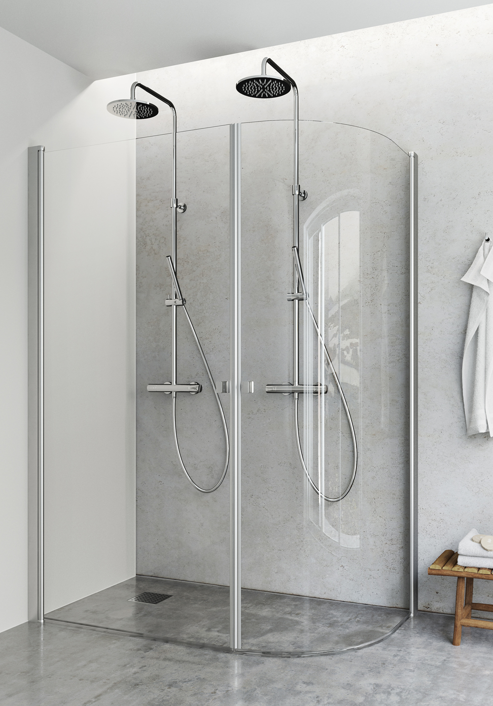 Brusehjørne med en svingbar J-dør og en svingbar lige dør. Dørene er vendbare og kan derfor højreeller venstremonteres. Brusehjørnet er monteringsvenligt og har limbare profiler i aluminium. Nemt at installere og justere for én person, InstaQuick™. 6 mm hærdet sikkerhedsglas. 8 mm frihøjde fra gulvet. Højde 2000 mm. Kan monteres med udvendige 12-mm-rør, cc 35 mm. 22 mm glideskinne medfølger. Se alle monteringsmulighederne på hafa.dk.