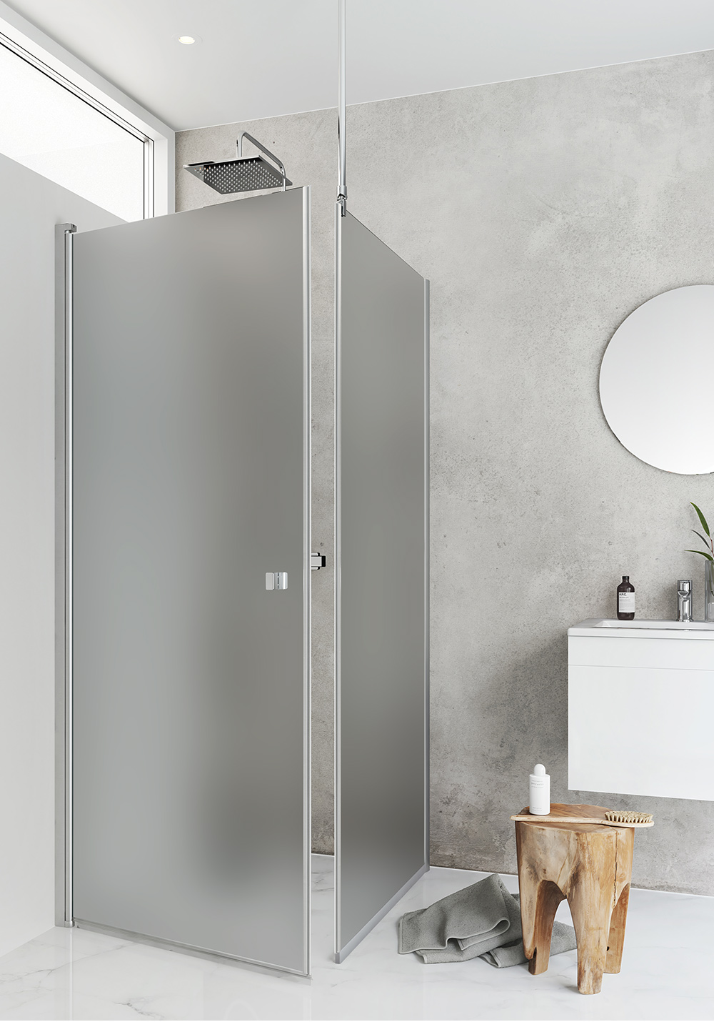 Brusehjørne med en svingbar lige brusevæg (A) og en fast brusevæg (B). Brusestangen kan monteres på tre måder: på væggen, i loftet eller vinkelret på samme væg, hvor bruseren monteres. Brusehjørnet er monteringsvenligt og har limbare profiler i aluminium. Nemt at installere og justere for én person, InstaQuick™. Henholdsvis 6 mm (A) og 8 mm (B) hærdet sikkerhedsglas. Vendbare brusevægge, som alle kan kombineres med hinanden. 8 mm frihøjde fra gulvet. Højde 2000 mm. (A) Kan monteres med udvendige 12-mm-rør, cc 35 mm. (B) Der fås en forlængelsesprofil til udvendige rør. 22 mm glideskinne medfølger.