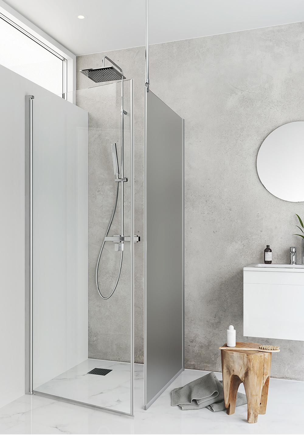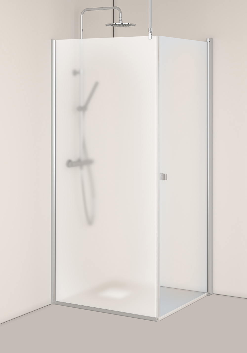 Brusehjørne med en svingbar lige brusevæg (A) og en fast brusevæg (B). Brusestangen kan monteres på tre måder: på væggen, i loftet eller vinkelret på samme væg, hvor bruseren monteres. Brusehjørnet er monteringsvenligt og har limbare profiler i aluminium. Nemt at installere og justere for én person, InstaQuick™. Henholdsvis 6 mm (A) og 8 mm (B) hærdet sikkerhedsglas. Vendbare brusevægge, som alle kan kombineres med hinanden. 8 mm frihøjde fra gulvet. Højde 2000 mm. (A) Kan monteres med udvendige 12-mm-rør, cc 35 mm. (B) Der fås en forlængelsesprofil til udvendige rør. 22 mm glideskinne medfølger.