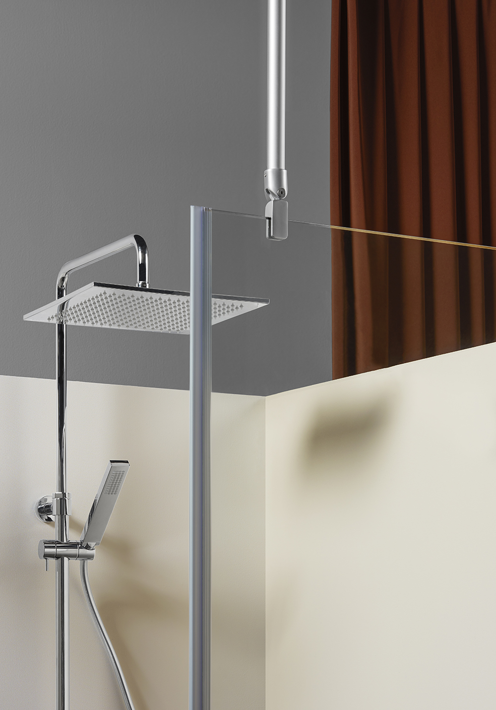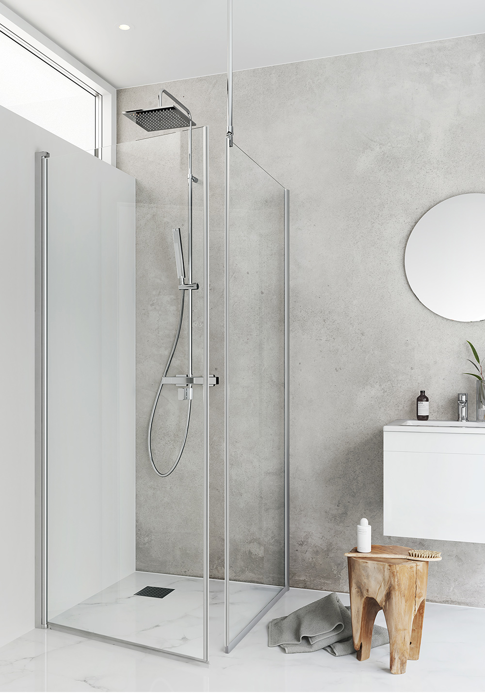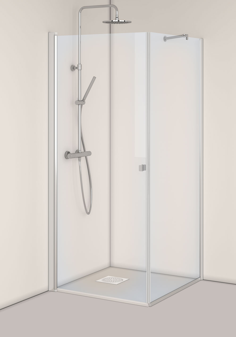 Rummeligt brusehjørne med lige brusedør og solid væg i klart glas. Brusehjørnet er stabilt med vægprofiler i anodiseret aluminium, der kan monteres med skrue eller limbrikker. Hjørnet har en patenteret løsning til nem installation og justering, Hafas InstaQuick ™. Døren har et løftehængsel så den ikke rører gulvet ved åbning og er vendbar så du kan vælge hvis den skal placeres til højre eller venstre. Brusestangen kan monteres på tre måder: mod væggen, mod loftet eller i en vinkel i forhold til samme væg, som brusevæggen er monteret. Døren har 6 mm hærdet sikkerhedsglas og kan monteres med påbygningsrør, 35 mm. Væggen har 8mm hærdet sikkerhedsglas og der kan tilkøbes forlængerprofil til påbygningsrør. Højde 2000 mm. 22 mm gulvliste, magnetliste og håndtag medfølger.