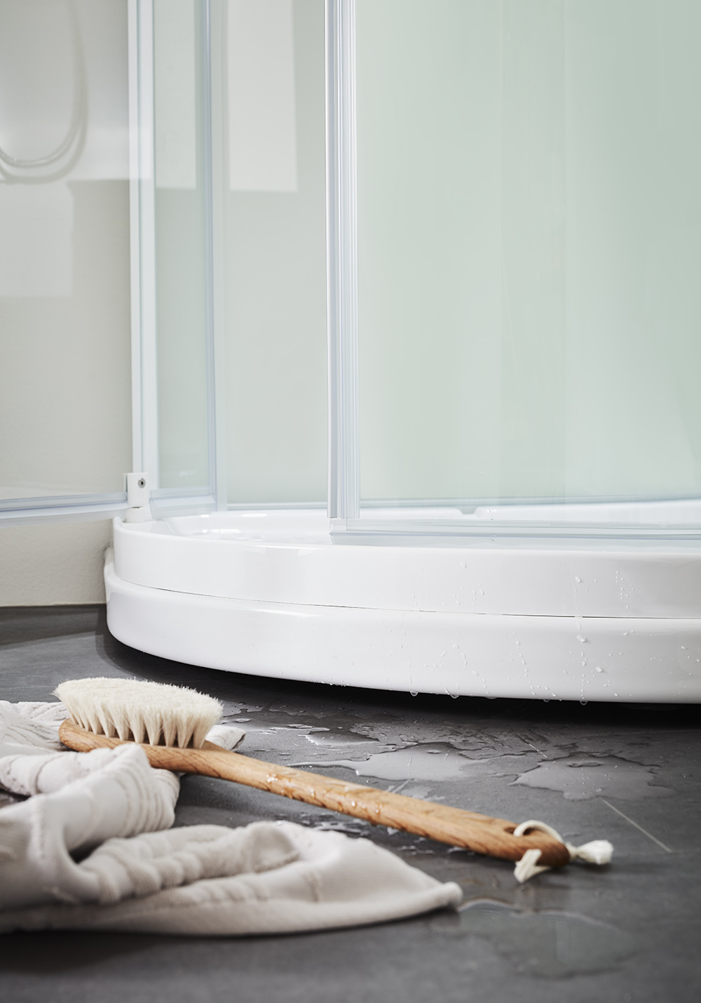 For at lette rengøringen af bruserdøre og brusevægge har bruserne store glatte overflader og profiler uden dybe hak. Misfarvninger fjernes med citron eller vinsyre; skyl grundigt bagefter. Kalkfarvede pletter fjernes med 50 graders varm husholdningseddike: gnid ind, lad den sidde, skyl af. Gentag, hvis pletterne er svære. Anvend husholdningssprit til at fjerne fedtpletter. Brug ikke rengøringsmidler, der er ætsende, sure eller slibende, da det kan forårsage permanent skade på overfladen.