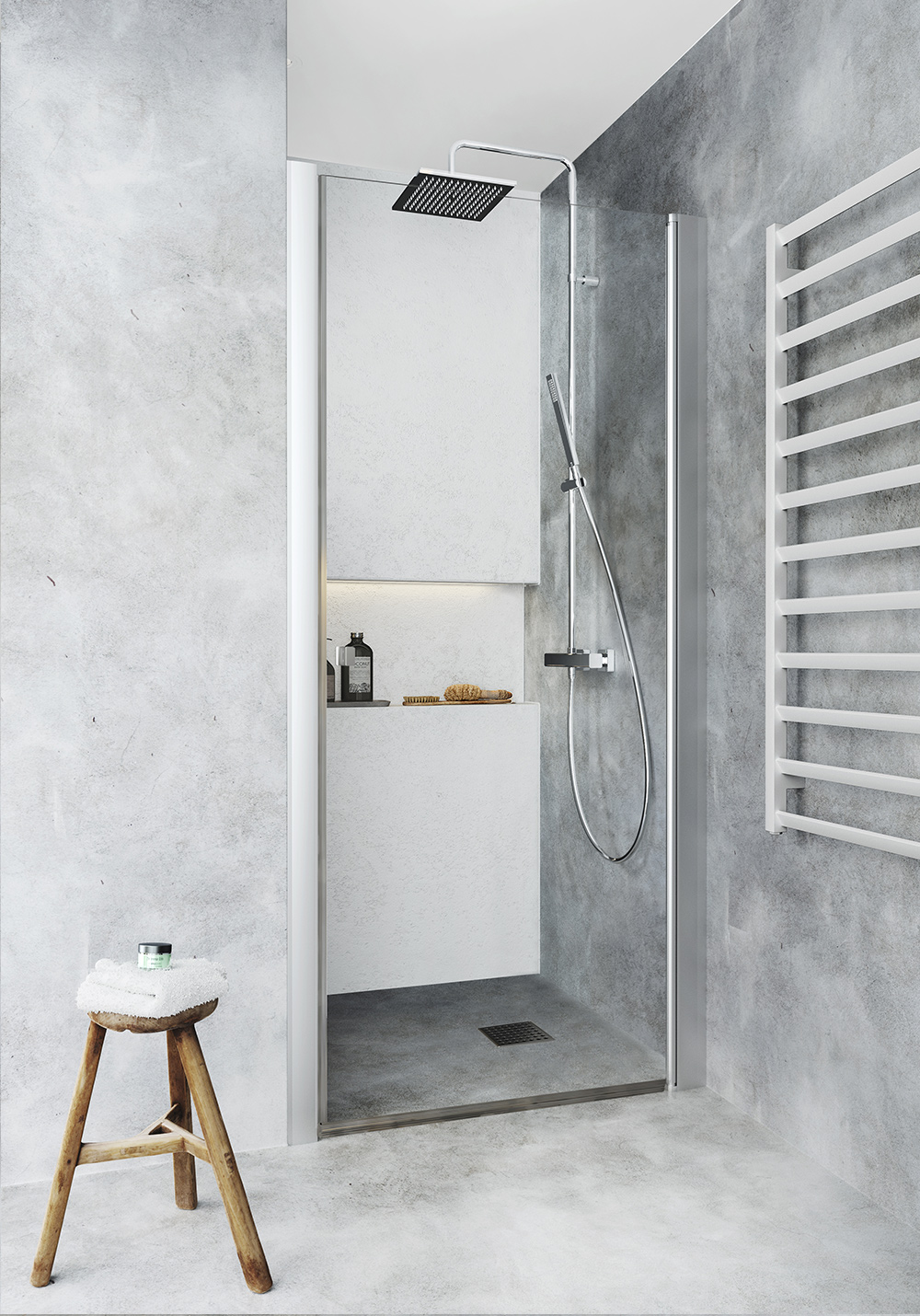 - Svingbar, lige brusedør med profil i aluminium eller sort mat