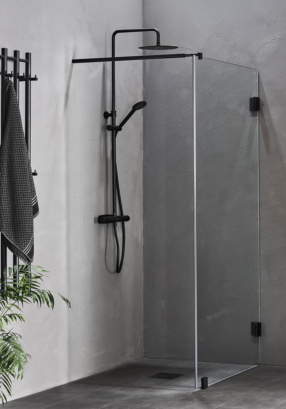 En eksklusiv brusevæg med slanke beslag og en elegant forhængsstang. Magnetliste inkluderet. Fuld højde 2000 mm og med 8 mm hærdet klart sikkerhedsglas.