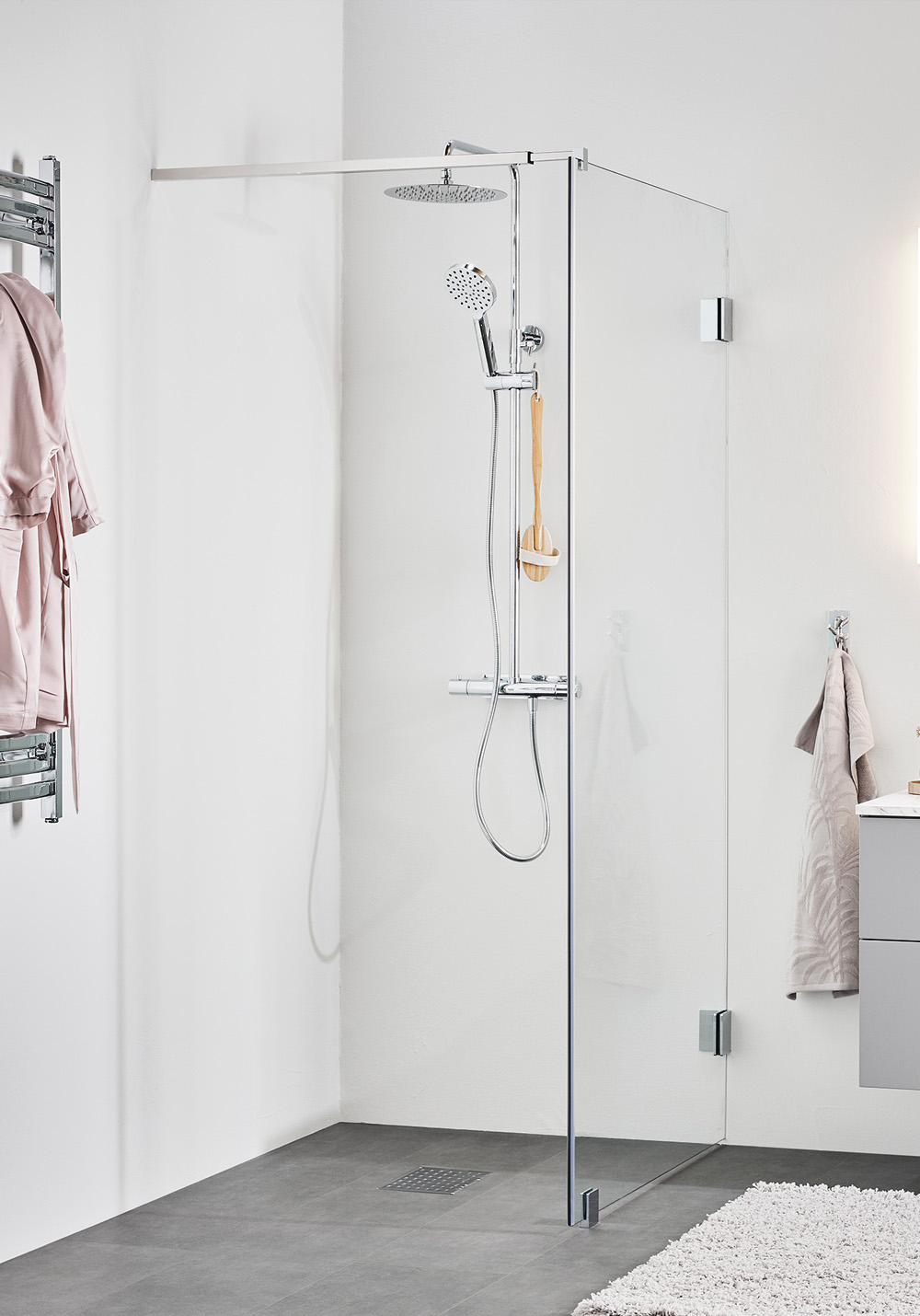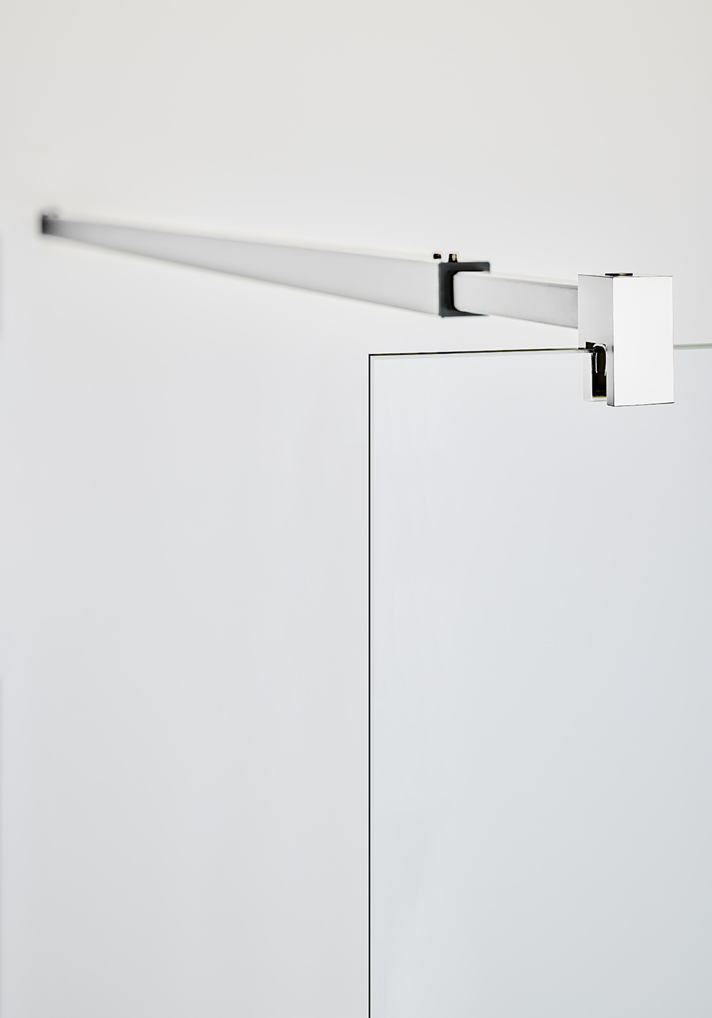 En eksklusiv brusevæg med slanke beslag og en elegant forhængsstang. Magnetliste inkluderet. Fuld højde 2000 mm og med 8 mm hærdet klart sikkerhedsglas.