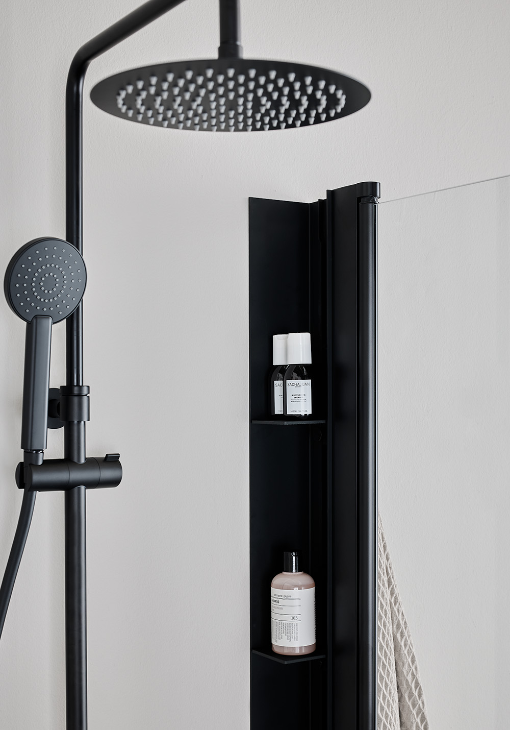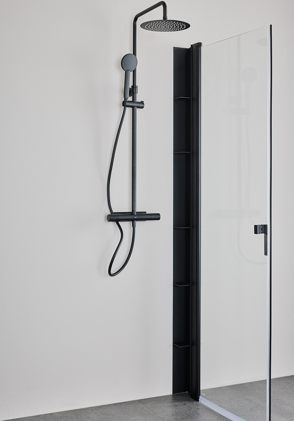 - Skjult, lettilgængelig opbevaring i bruseren