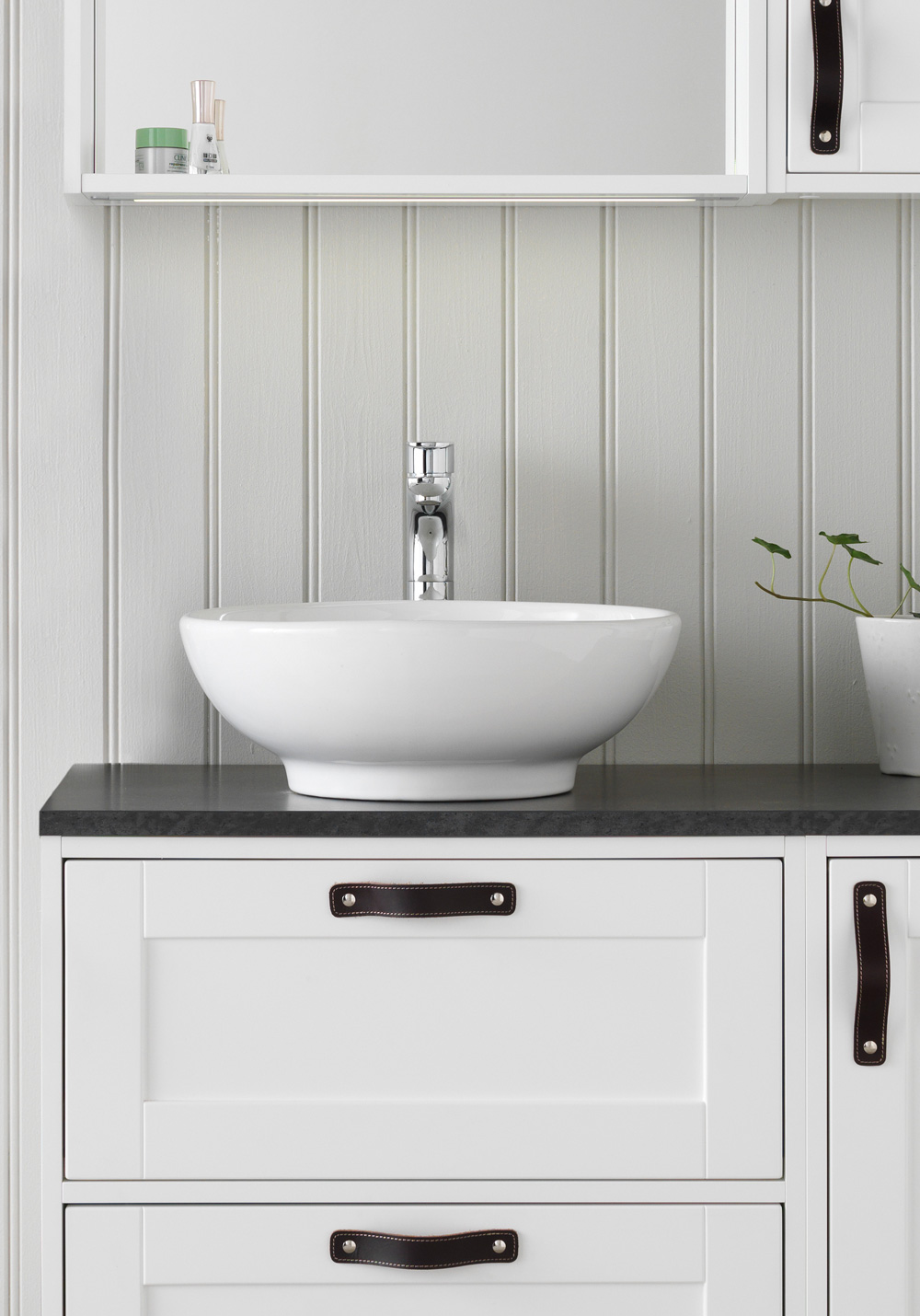 Klassisk rund, fritstående håndvask i porcelæn med overløb. Kombineres med højt blandingsbatteri, som monteres på bordpladen.
