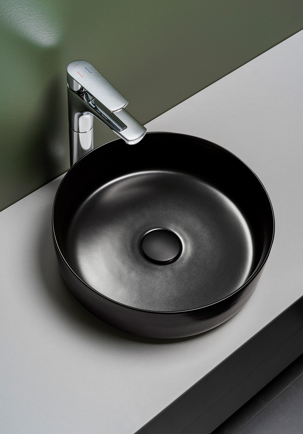 Tynd fritstående håndvask i porcelæn med sort mat finish uden overløb. Kombineres med højt blandingsbatteri, som monteres på bordpladen. Suppler med bundventil.