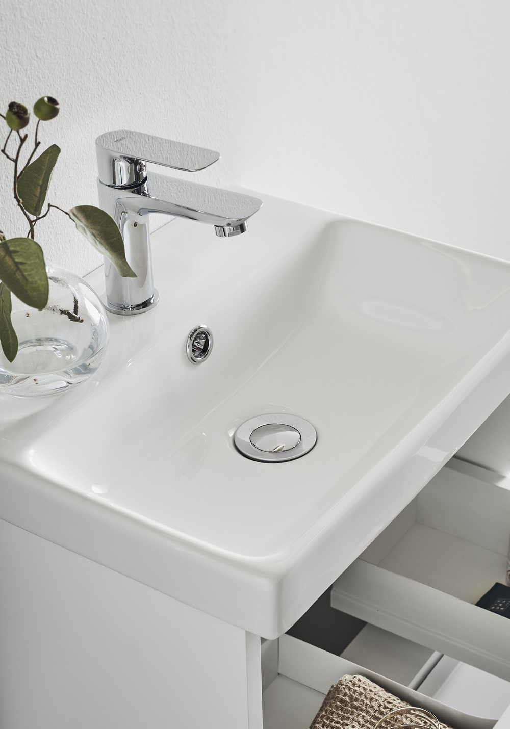 Elegant og fin håndvask i porcelæn, med overløbssikring. Køb til bundventil. Vi anbefaler blandingsbaterier med strålesamler til denne vask.