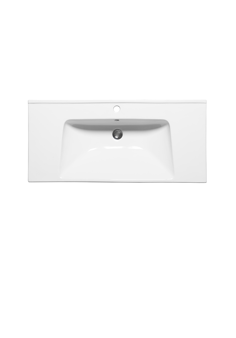 Moderne håndvask i porcelæn med en spændstig form, der strækker sig frem til kanten. Den er udviklet af vores egne designere. Den unikke form harmonerer flot med det tilhørende skabs stramme linjer, og der er afsætningsplads på begge sider.