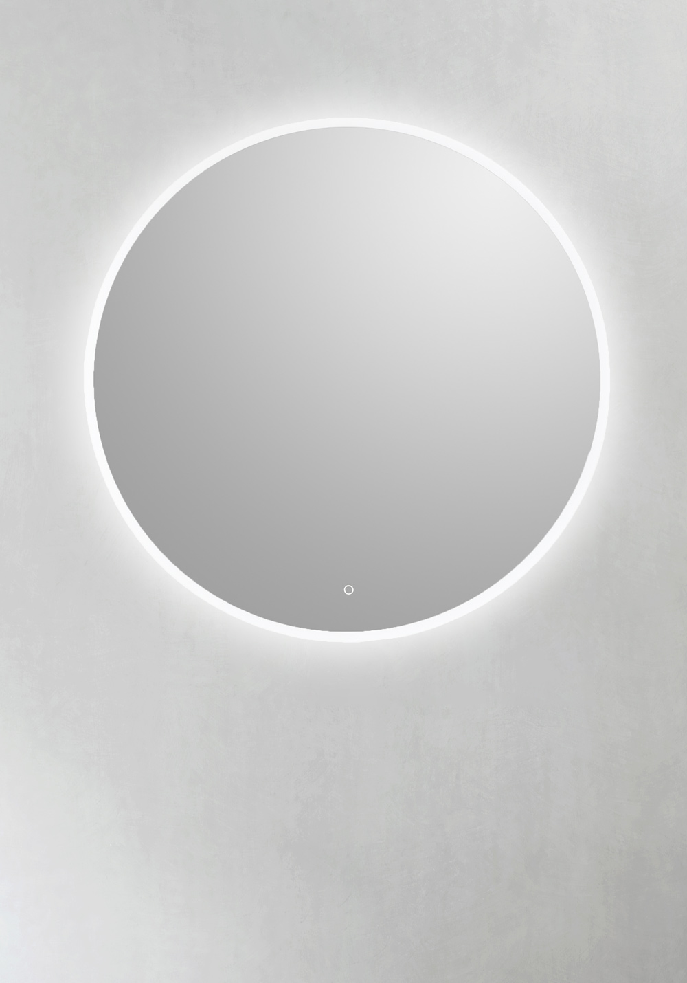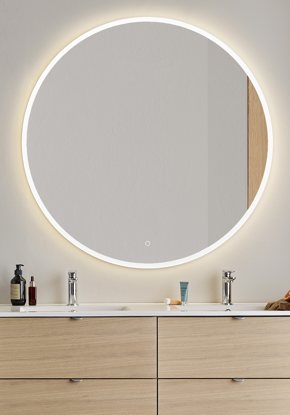 Stilrent, rundt spejl med dekorativ og funktionel LED-belysning langs kanten. Touchfunktionen gør, at lyset kan dæmpes. Ophængsbeslaget er justerbar i siden, som gør monteringen enkel.