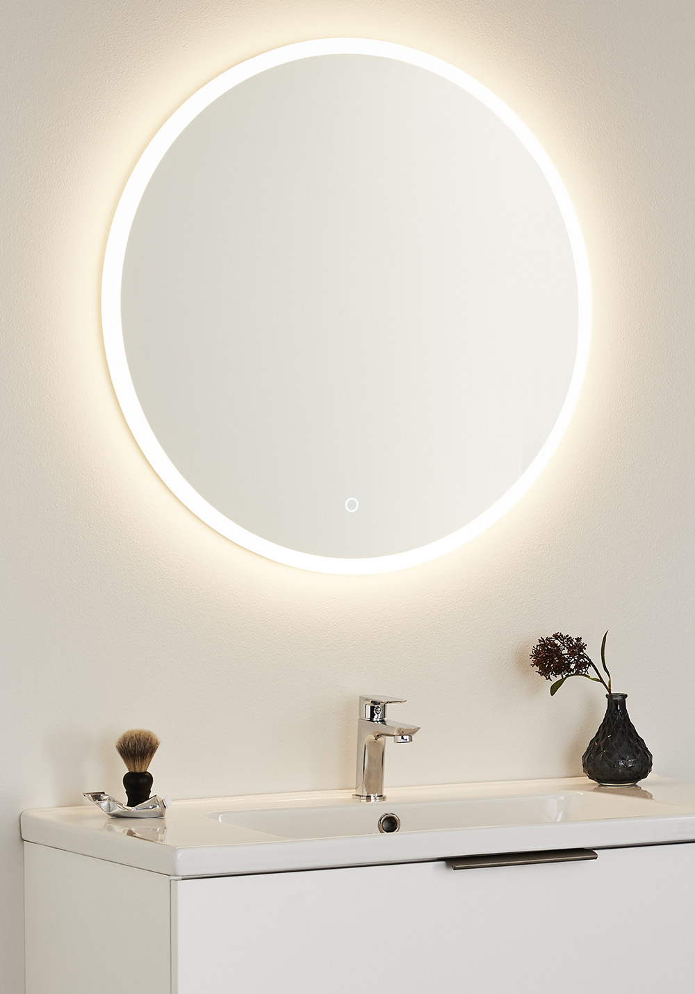 Stilrent, rundt spejl med dekorativ og funktionel LED-belysning langs kanten. Touchfunktionen gør, at lyset kan dæmpes. Ophængsbeslaget er justerbar i siden, som gør monteringen enkel.
