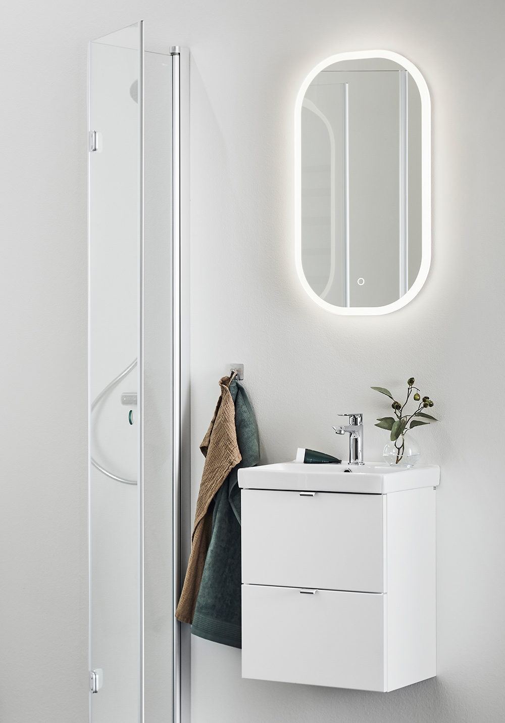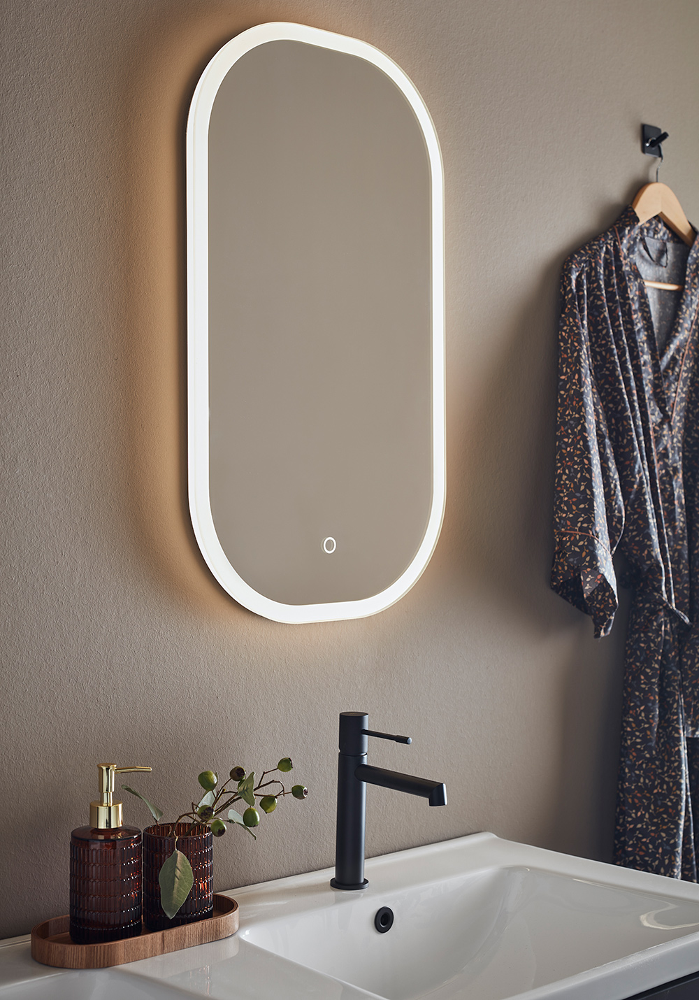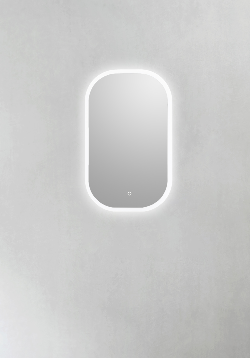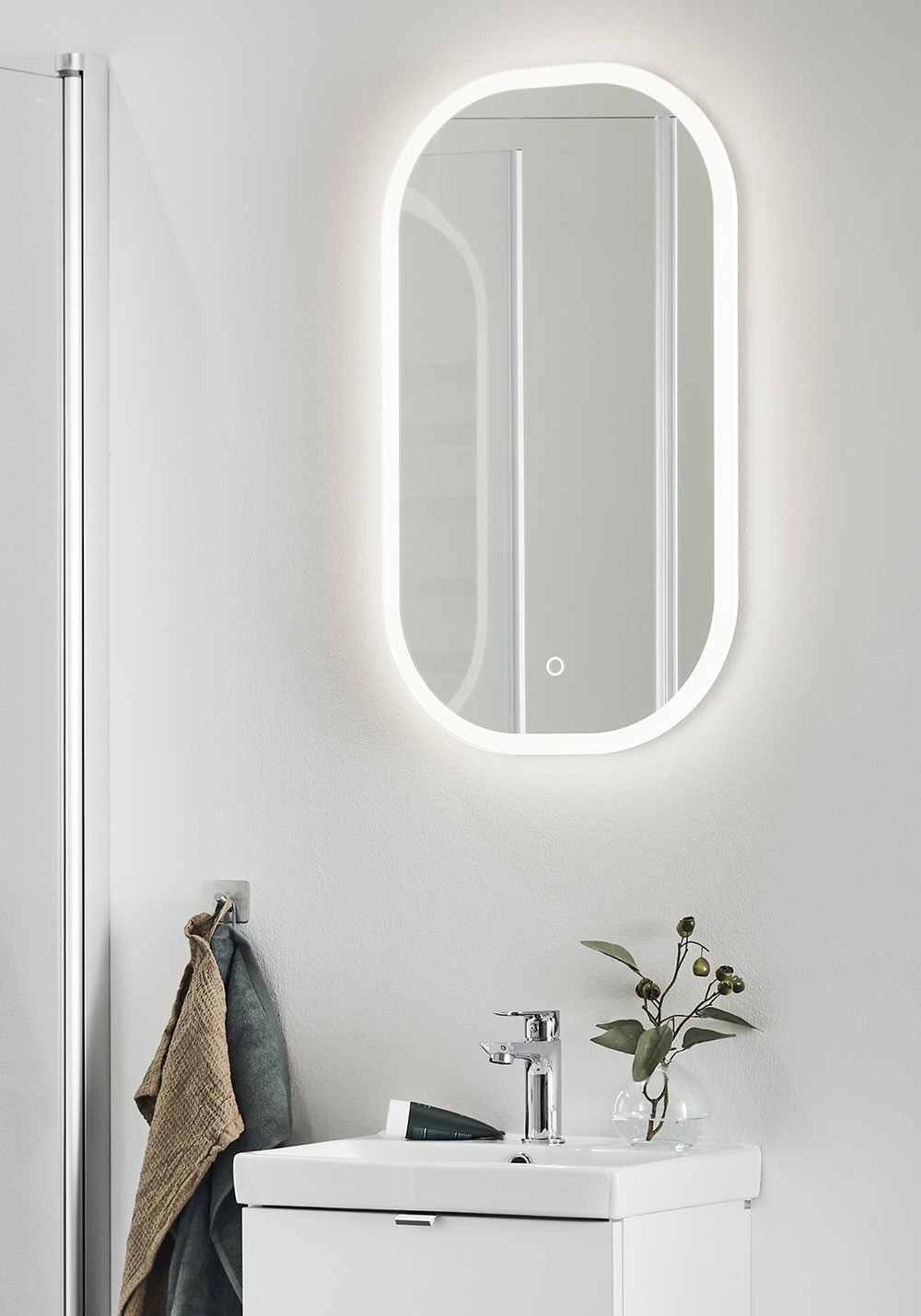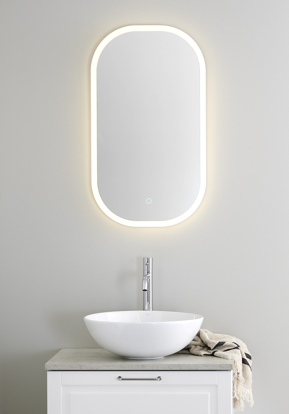 Blødt afrundet spejl med dæmpbar belysning rundt omkring. Dekorativ og funktionel LED-belysning med varmt hvidt lys styret af berøringsfunktion. Spejlet husker den sidste lysindstilling til / fra. IP44