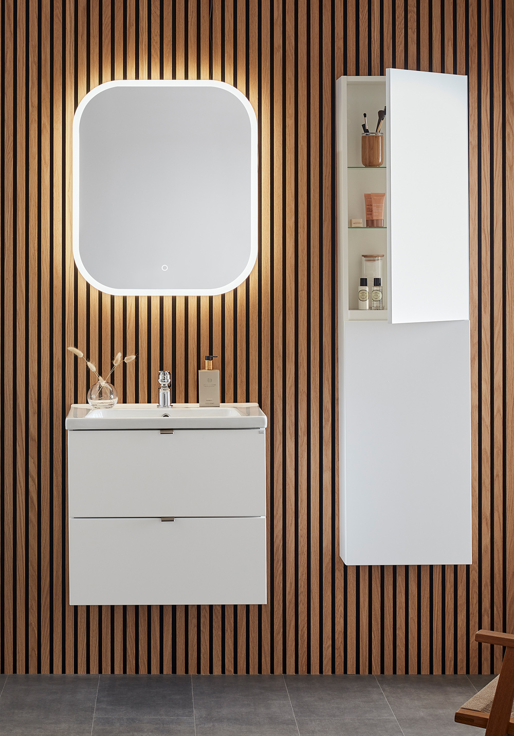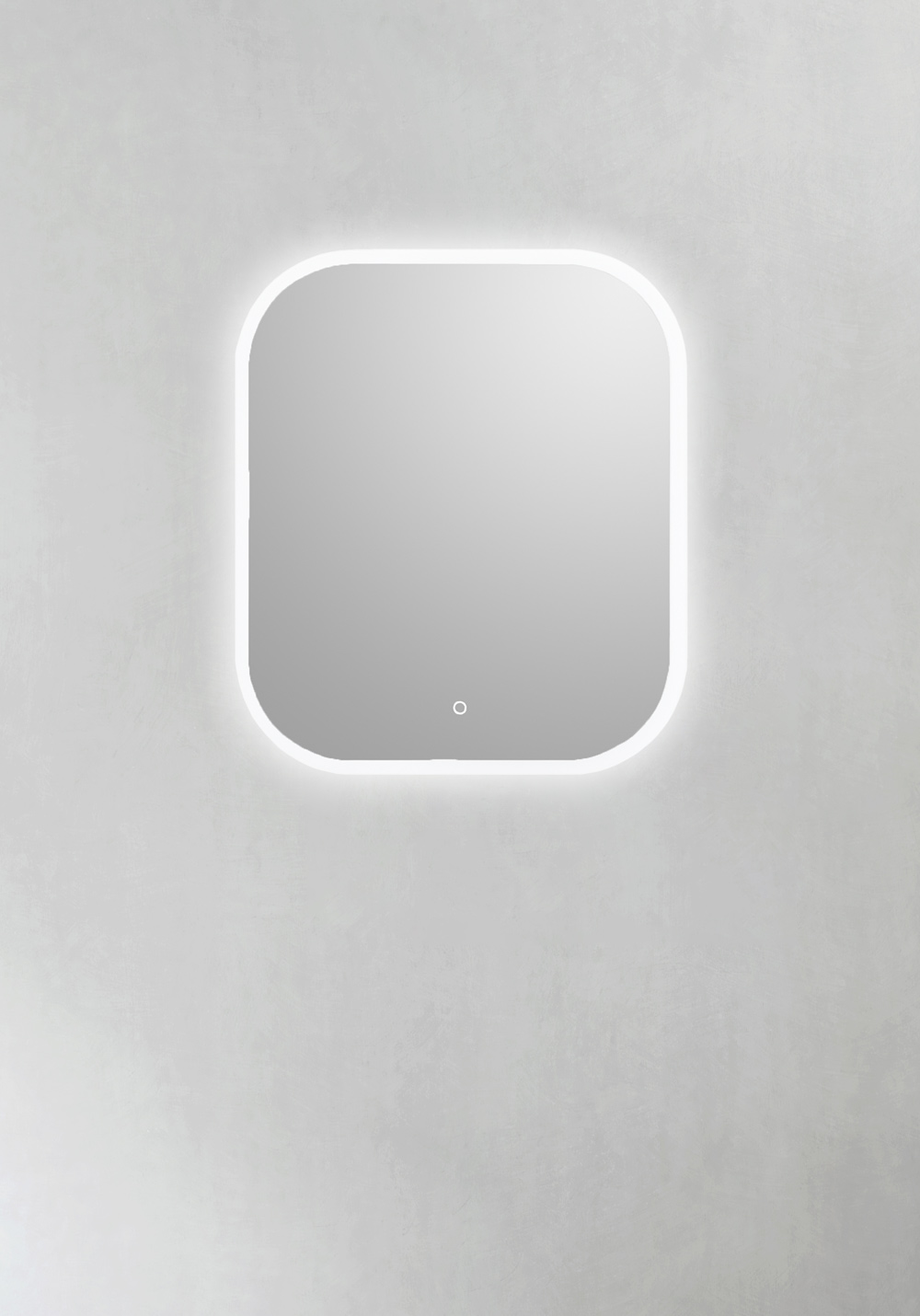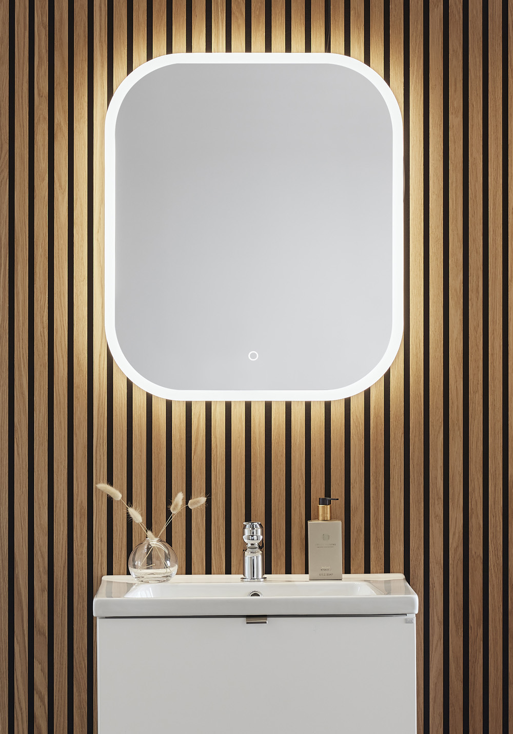 Blødt afrundet spejl med dæmpbar belysning rundt omkring. Dekorativ og funktionel LED-belysning med varmt hvidt lys styret af berøringsfunktion. Spejlet husker den sidste lysindstilling til / fra. IP44
