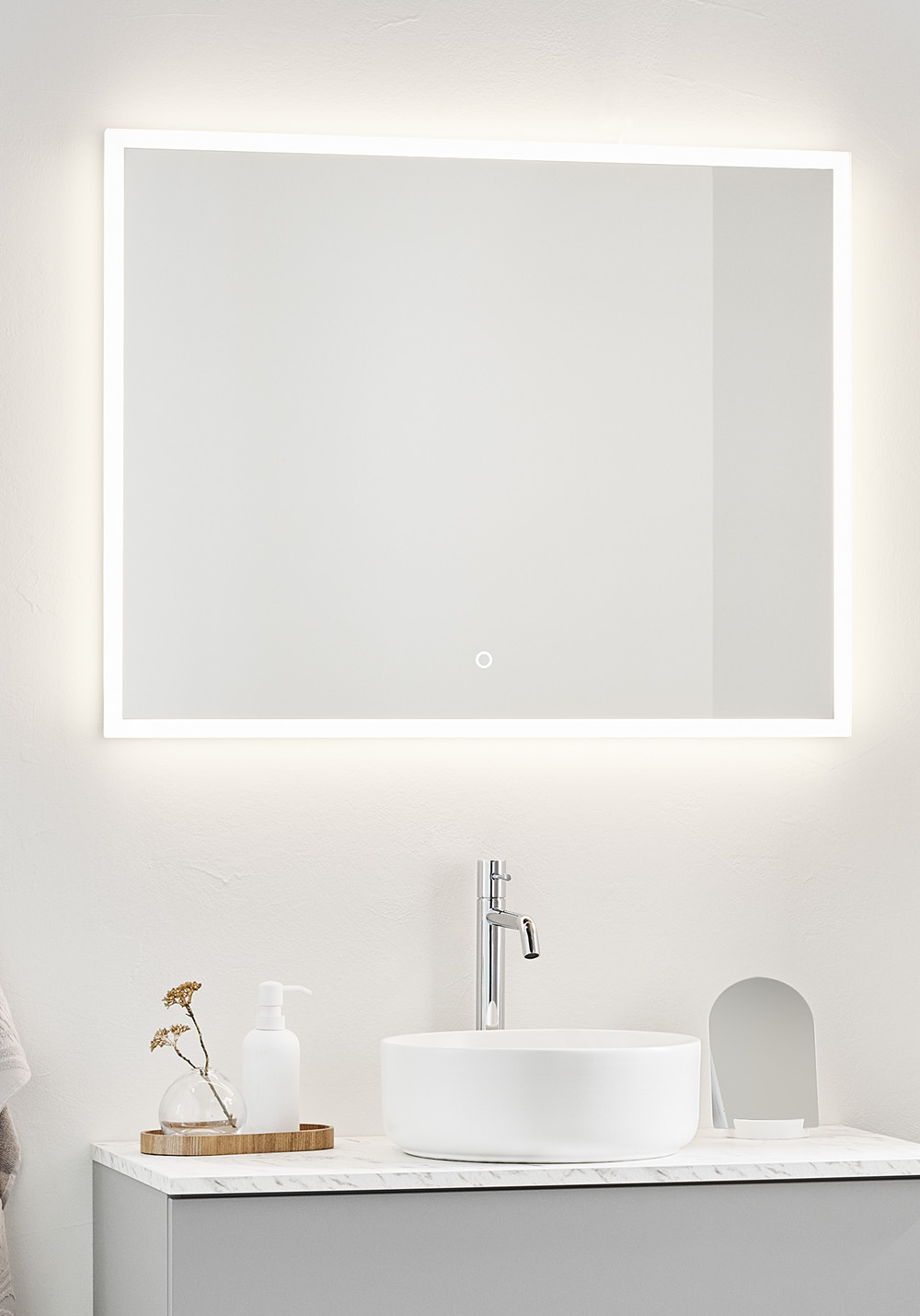 Stilfuldt, rektangulært spejl med dekorativ og funktionel dæmpbar LED-belysning med varmt hvidt lys på ca. 3000K. Touch-funktion med hukommelse, der husker den sidste indstilling, når den tændes/slukkes. IP44.