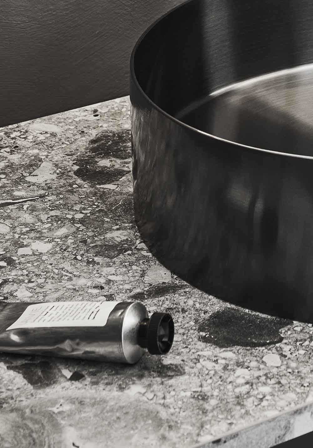 OnTop bordplader i laminat. I lyst stenmønstre. Stansning udføres af installatøren afhængigt af armatur, vask og valg af placering.